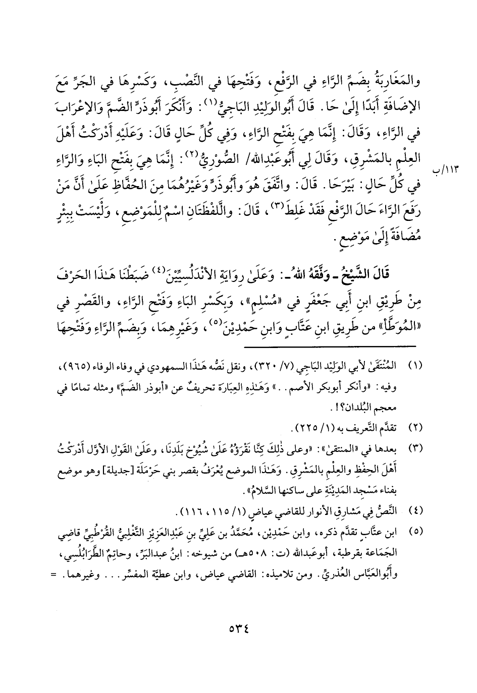 قال الشيخ- وفقه الله-: وعلى رواية الأندلسيين ضبطنا هذا الحرف من طريق ابن أبي جعفر في "مسلم"، وبكسر الباء وفتح الراء، والقصر في "الموطأ" من طريق ابن عتاب وابن حمدين، وغيرهما، وبضم الراء وفتحها