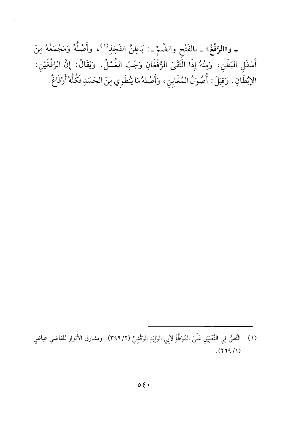 - و"الرفغ"- بالفتح والضم-: باطن الفخذ، وأصله ومجمعه من أسفل البطن، ومنه إذا التقى الرفغان وجب الغسل. ويقال: إن الرفغين: الإبطان. وقيل: أصول المغابن، واصله ما ينطوي من الجسد فكله أرفاغ.