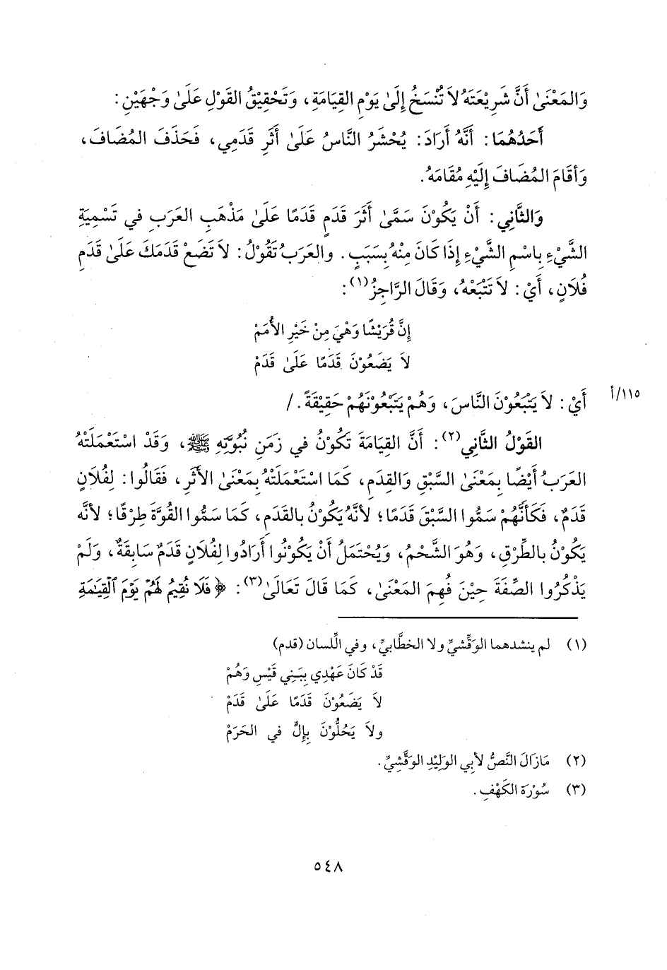 القول الثاني: أن القيامة تكون في زمن نبوته صلى الله عليه وسلم، وقد استعملته العرب أيضاً بمعنى السبق والقدم، كما استعملته بمعنى الأثر، فقالوا: لفلان قدم، فكأنهم سموا السبق قدماً؛ لأنه يكون بالقدم، كما سموا القوة طرقاً؛ لأنه يكون بالطرق، وهو الشحم، ويحتمل أن يكونوا أرادوا لفلان قدم سابقة، ولم يذكروا الصفة حين فهم المعنى، كما قال تعالى: {فَلا نُقِيمُ لَهُمْ يَوْمَ الْقِيَامَةِ