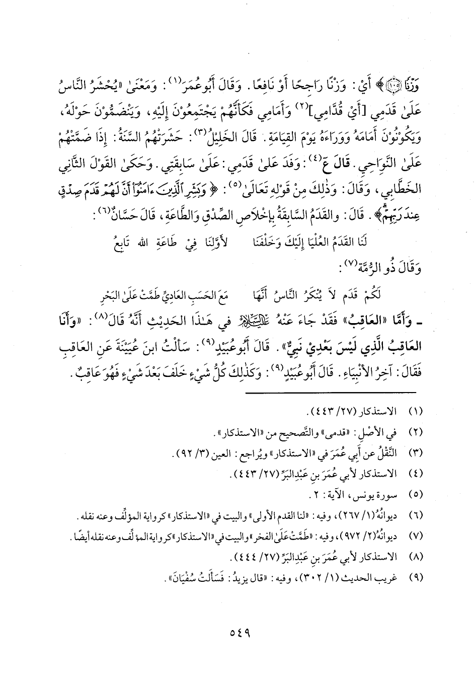 وَزْناً (105)} أي: وزناً راجحاً أو نافعاً. وقال أبو عمر: ومعنى "يحشر الناس على قدمي [أي قدامي] وأمامي فكأنهم يجتمعون إليه، وينضمون حوله، ويكونون أمامه ووراءه يوم القيامة. قال الخليل: حشرتهم السنة: إذا ضمتهم على النواحي. قال ع: وفد على قدمي: على سابقتي. وحكى القول الثاني الخطابي، وقال: وذلك من قوله تعالى: {وَبَشِّرْ الَّذِينَ آمَنُوا أَنَّ لَهُمْ قَدَمَ صِدْقٍ عِنْدَ رَبِّهِمْ}. قال: والقدم السابقة بإخلاص الصدق والطاعة، قال حسان:
