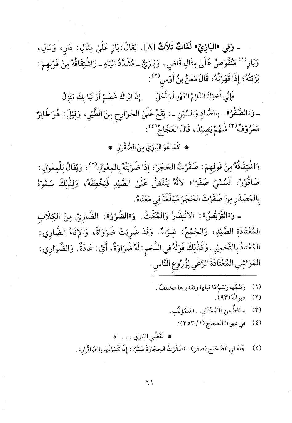 - وفي "البازي" لغات ثلاث [8]. يقال: باز على مثال: دار، ومال، وباز منقوص على مثال قاض، وبازي- مشدد الياء- واشتقاقه من قولهم: بزيته؛ إذا قهرته، قال معن بن أوس: