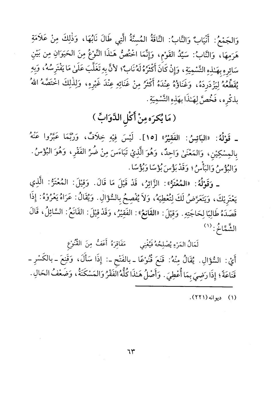 - قوله: "البائس: الفقير" [15]. ليس فيه خلاف، وربما عبروا عنه بالمسكين، والمعنى واحد، وهو الذي تباءس من ضر الفقر، وهو البؤس. والبؤس والبأس؛ وقد بؤس بؤساً وبؤساً.