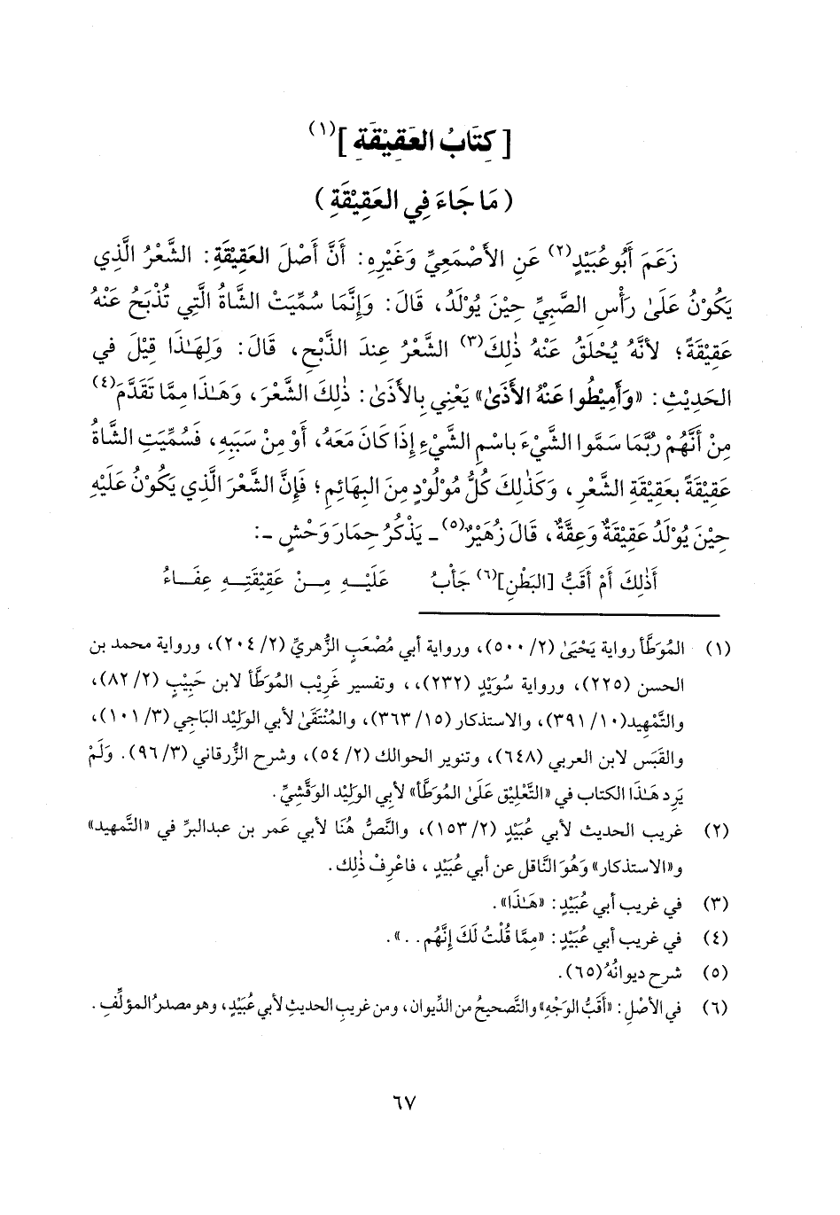 زعم أبو عبيد عن الأصمعي وغيره: أن أصل العقيقة: الشعر الذي يكون على رأس الصبي حين يولد، قال: وإنما سميت الشاة التي تذبح عنه عقيقة؛ لأنه يحلق عنه ذلك الشعر عند الذبح، قال: ولهذا قيل في الحديث: "وأميطوا عنه الأذى" يعني بالأذى: ذلك الشعر، وهذا مما تقدم من أنهم ربما سموا الشيء باسم الشيء إذا كان معه، أو من سببه، فسميت الشاة عقيقة بعقيقة الشعر، وكذلك كل مولود من البهائم؛ فإن الشعر الذي يكون عليه حين يولد عقيقة وعقة، قال زهير- يذكر حمار وحش-: