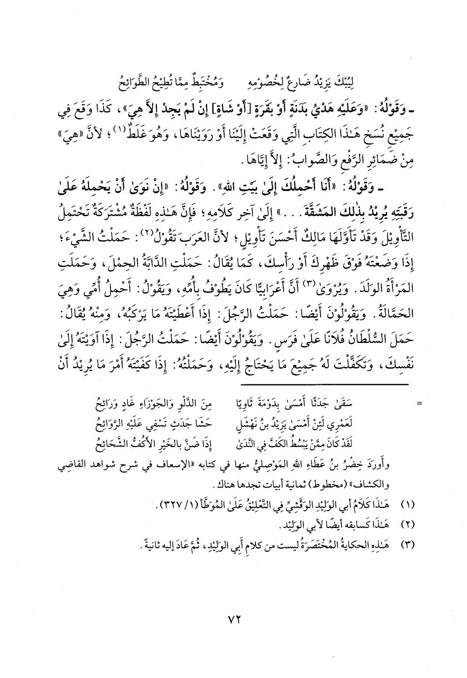- وقوله: "أنا أحملك إلى بيت الله". وقوله: "إن نوى أن يحمله على رقبته يريد بذلك المشقة ... " إلى آخر كلامه؛ فإن هذه لفظة مشتركة تحتمل التأويل وقد تأولها مالك أحسن تأويل؛ لأن العرب تقول: حملت الشيء؛ إذا وضعته فوق ظهرك أو رأسك، كما يقال: حملت الدابة الحمل، وحملت المرأة الولد. ويروى أن أعرابياً كان يطوف بأمه، ويقول: أحمل أمي وهي الحمالة. ويقولون أيضاً: حملت الرجل: إذا أعطيته ما يركبه، ومنه يقال: حمل السلطان فلاناً على فرس. ويقولون أيضاً: حملت الرجل: إذا آويته إلى نفسك، وتكفلت له جميع ما يحتاج إليه، وحملته: إذا كفيته أمر ما يريد أن