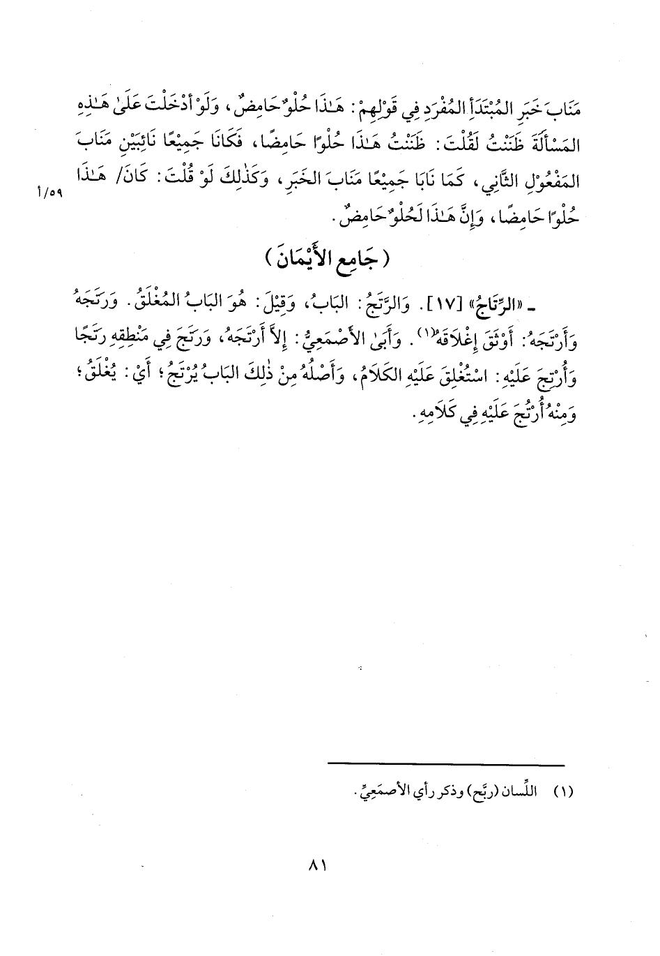 - "الرتاج" [17]. والرتج: الباب، وقيل: هو الباب المغلق. ورتجه وأرتجه: أوثق إغلاقه. وأبى الأصمعي: إلا أرتجه، ورتج في منطقه رتجاً وأرتج عليه: استغلق عليه الكلام، وأصله من ذلك الباب يرتج؛ أي: يغلق؛ ومنه أرتج عليه في كلامه.