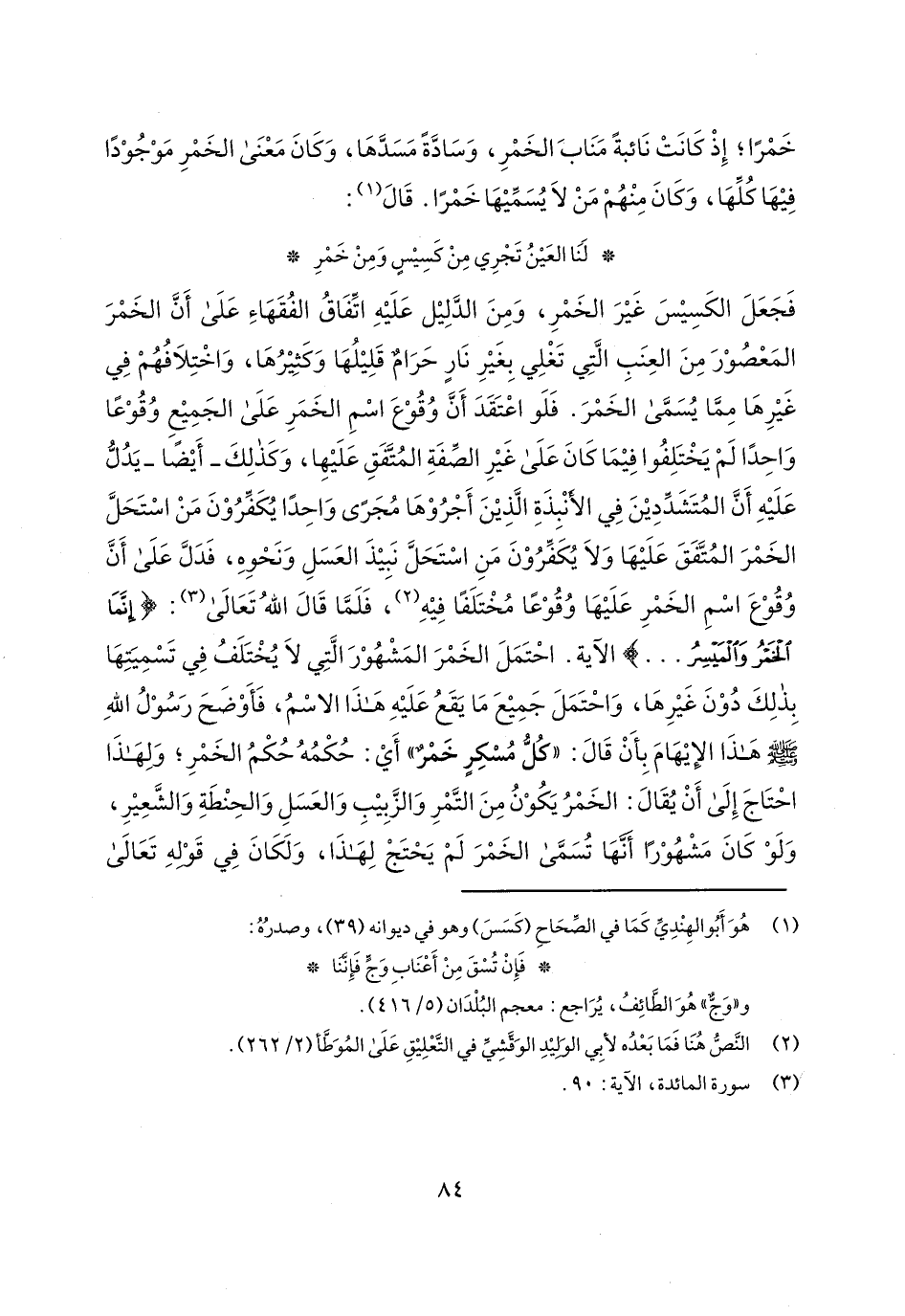 فجعل الكسيس غير الخمر، ومن الدليل عليه اتفاق الفقهاء على أن الخمر المعصور من العنب التي تغلي بغير نار حرام قليلها وكثيرها، واختلافهم في غيرها مما يسمى الخمر. فلو اعتقد أن وقوع اسم الخمر على الجميع وقوعاً واحداً لم يختلفوا فيما كان على غير الصفة المتفق عليها، وكذلك- أيضاً- يدل عليه أن المتشددين في الأنبذة الذين أجروها مجرى واحداً يكفرون من استحل الخمر المتفق عليها ولا يكفرون من استحل نبيذ العسل ونحوه، فدل على أن وقوع اسم الخمر عليها وقوعاً مختلفاً فيه، فلما قال الله تعالى: {إِنَّمَا الْخَمْرُ وَالْمَيْسِرُ ...} الآية. احتمل الخمر المشهور التي لا يختلف في تسميتها بذلك دون غيرها، واحتمل جميع ما يقع عليه هذا الاسم، فأوضح رسول الله صلى الله عليه وسلم هذا الإيهام بأن قال: "كل مسكر خمر" أي: حكمه حكم الخمر؛ ولهذا احتاج إلى أن يقال: الخمر يكون من التمر والزبيب والعسل والحنطة والشعير، ولو كان مشهوراً أنها تسمى الخمر لم يحتج لهذا، ولكان في قوله تعالى