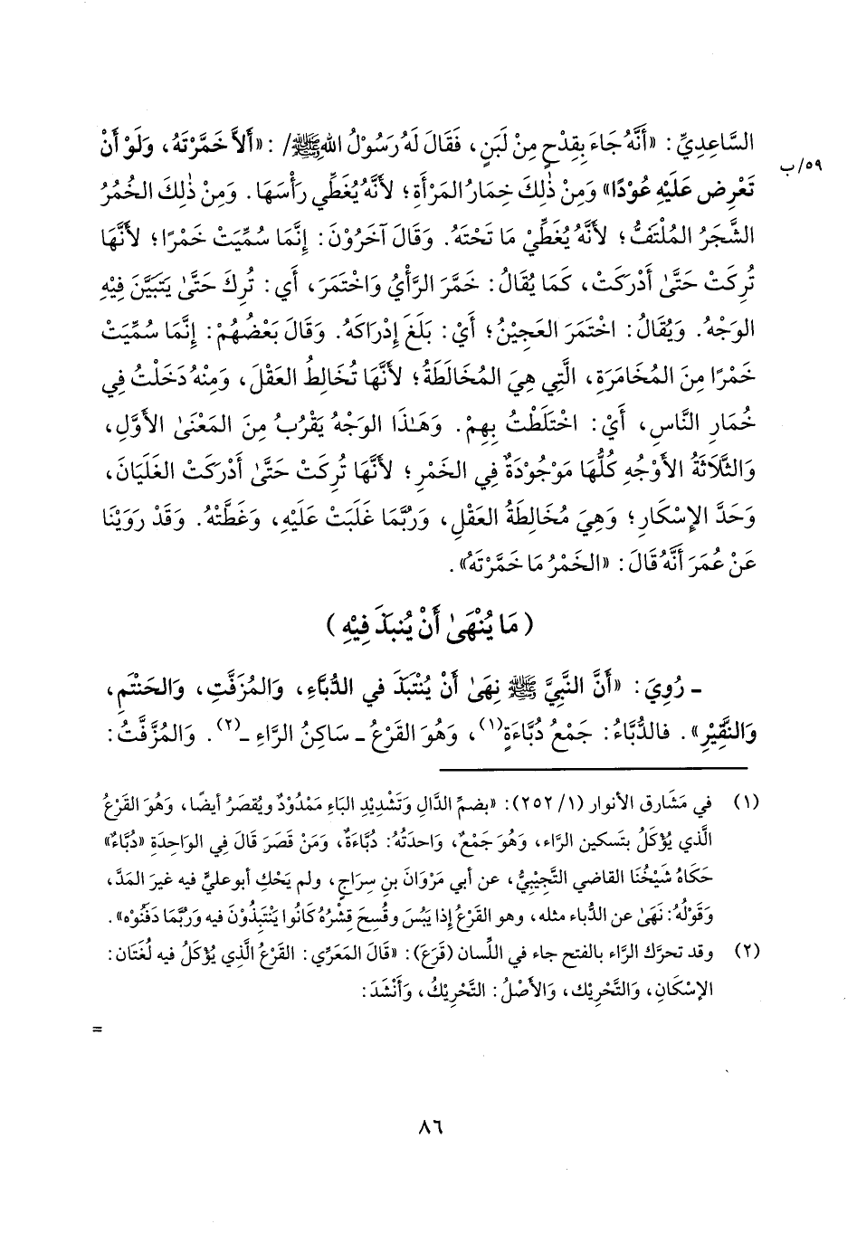 - روي: "أن النبي صلى الله عليه وسلم نهى أن ينتبذ في الدباء، والمزفت، والحنتم، والنقير". فالدباء: جمع دباءة، وهو القرع- ساكن الراء-. والمزفت: