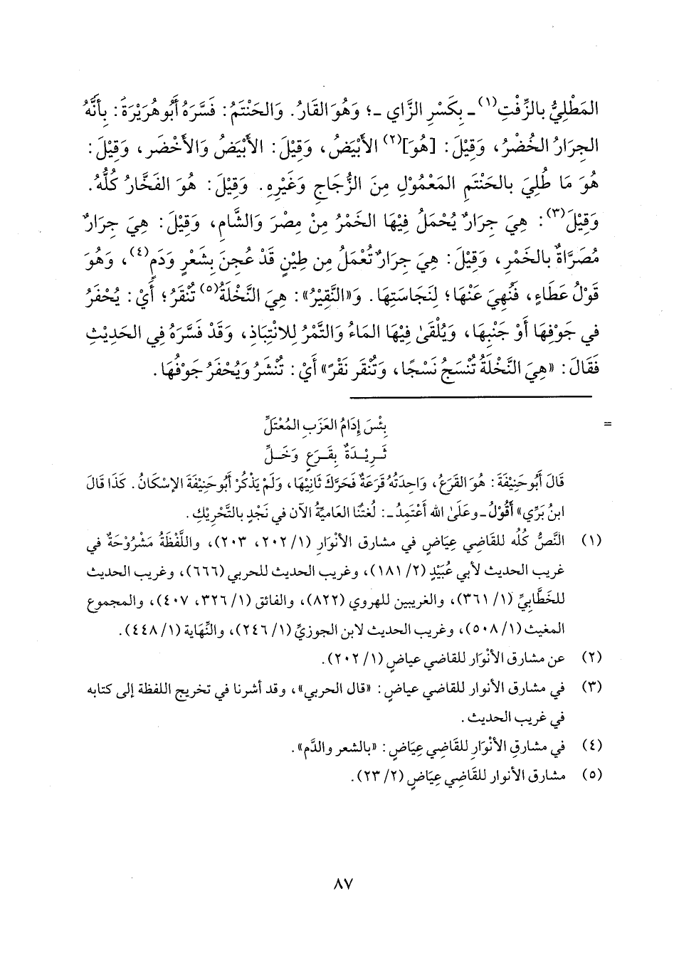 المطلي بالزفت- بكسر الزاي-؛ وهو القار. والحنتم: فسره أبو هريرة: بأنه الجرار الخضر، وقيل: [هو] الأبيض، وقيل: الأبيض والأخضر، وقيل: هو ما طلي بالحنتم المعمول من الزجاج وغيره. وقيل: هو الفخار كله. وقيل: هي جرار يحمل فيها الخمر من مصر والشام، وقيل: هي جرار مصراة بالخمر، وقيل: هي جرار تعمل من طين قد عجن بشعر ودم، وهو قول عطاء، فنهي عنها؛ لنجاستها. و"النقير": هي النخلة تنقر؛ أي: يحفر في جوفها أو جنبها، ويلقى فيها الماء والتمر للانتباذ، وقد فسره في الحديث فقال: "هي النخلة تنسج نسجاً، وتنقر نقر" أي: تنشر ويحفر جوفها.