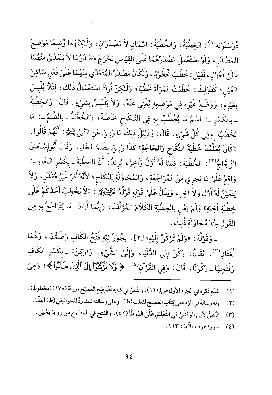 درستويه: الخطبة، والخطبة: اسمان لا مصدران، ولكنهما وضعا موضع المصدر، ولو استعمل مصدرهما على القياس لخرج مصدر ما لا يتعدى منهما على فعول، فقيل: خطب خطوباً، ولكان مصدر المتعدي منهما على فعل ساكن العين؛ كقولك: خطبت المرأة خطباً؛ ولكن ترك استعمال ذلك؛ لئلا يلبس بغيره، ووضع غيره في موضعه يغني عنه، ولا يلتبس بشيء. قال: والخطبة- بالكسر-: اسم ما يخطب به في النكاح خاصة، والخطبة- بالضم-: ما يخطب به في كل شيء. قال: ودليل ذلك ما روي عن النبي صلى الله عليه وسلم: أنهم قالوا: "كان يعلمنا خطبة النكاح والحاجة" كذا روي بضم الخاء. وقال أبو إسحق الزجاج: الخطبة: فيما له أول وآخر، يريد: أن الخطبة- بكسر الخاء-: واقع على ما يجري من المراجعة، والمحاولة للنكاح؛ لأنه أمر غير مقدر، ولا يتعين له أول ولا آخر، ويدل على قوله قوله عليه السلام: "لا يخطب أحدكم على خطبة أخيه" ولم يعن بالخطبة الكلام المؤلف، وإنما أراد: ما يتراجع به من القول عند محاولة ذلك.
