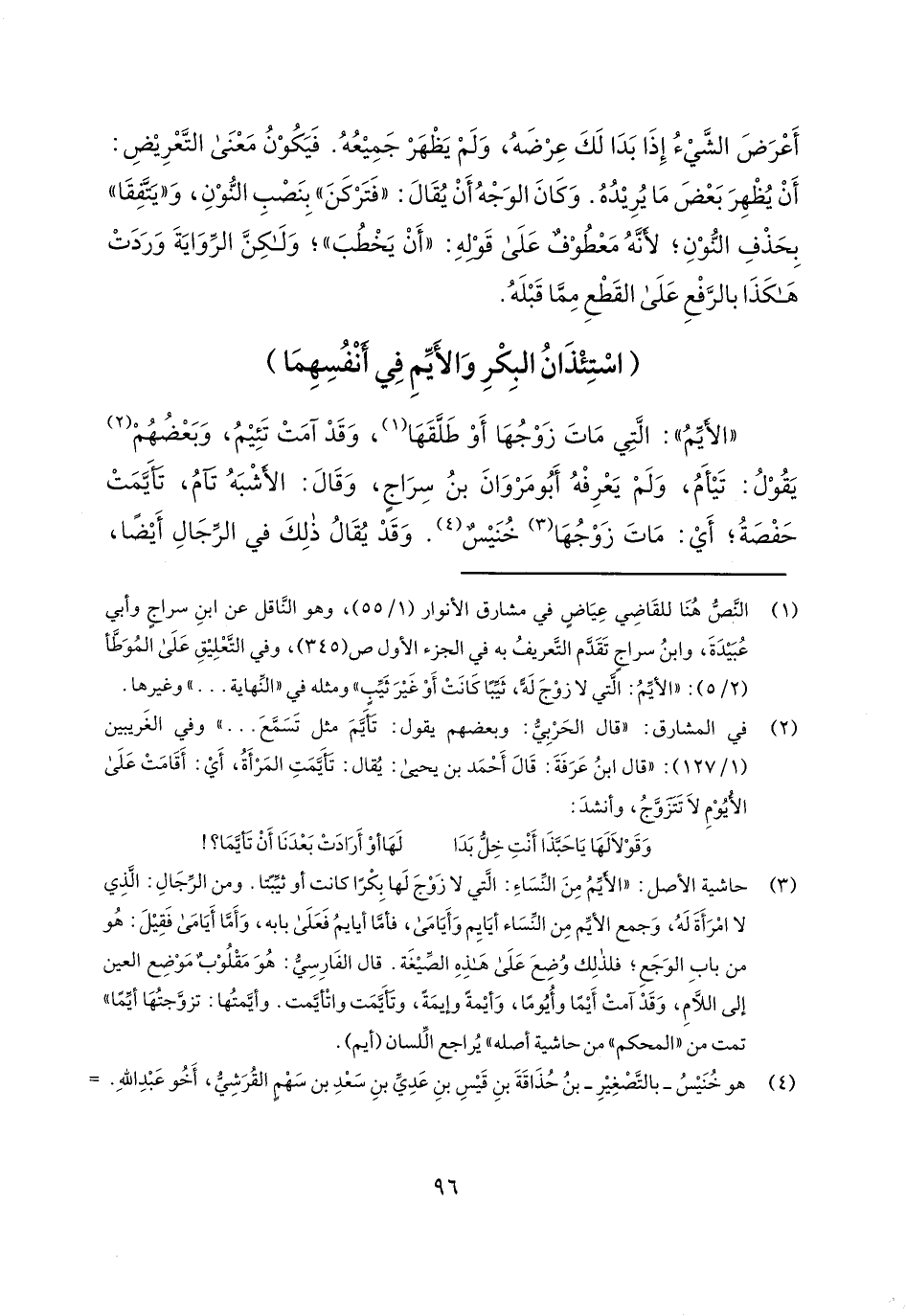 "الأيم": التي مات زوجها أو طلقها، وقد آمت تئيم، وبعضهم يقول: تيأم، ولم يعرفه أبو مروان بن سراج، وقال: الأشبه تآم، تأيمت حفصة؛ أي: مات زوجها خنيس. وقد يقال ذلك في الرجال أيضاً،