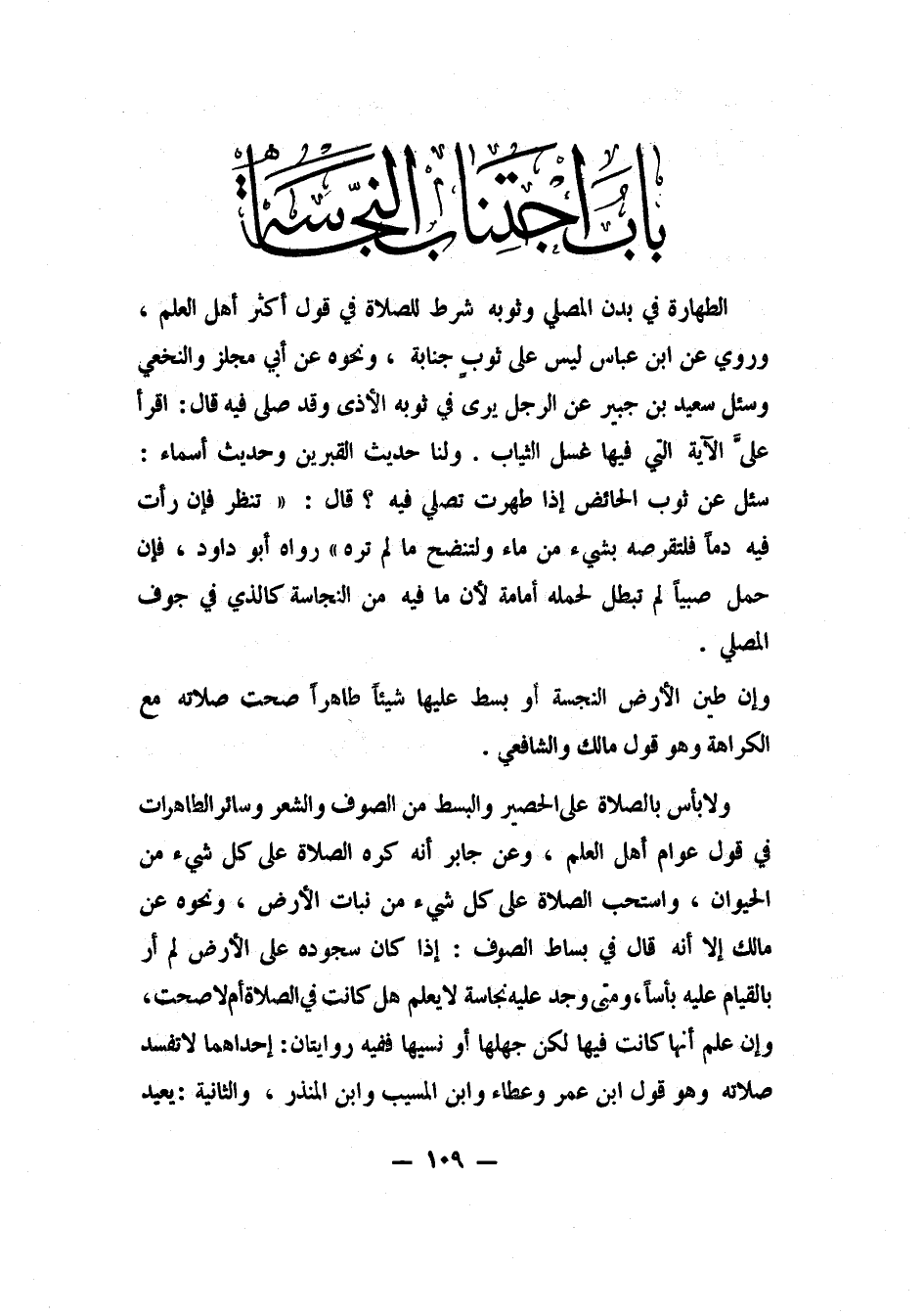 الطهارة في بدن المصلي وثوبه شرط للصلاة، في قول أكثر أهل العلم. وروي عن ابن عباس: "ليس على ثوبٍ جنابة"، ونحوه عن أبي مجلز والنخعي. وسئل سعيد بن جبير عن الرجل يرى في ثوبه الأذى وقد صلى فيه قال: "اقرأ عليَّ الآية التي فيها غسل الثياب". ولنا: حديث القبرين، وحديث أسماء: "سئل عن ثوب الحائض إذا طهرت تصلي فيه؟ قال: تنظر، فإن رأت فيه دماً فلتقرصه بشيء من ماء، ولتنضح ما لم تره". 1 رواه أبو داود. فإن حمل صبياً، لم تبطل لحمله أمامة، لأن ما فيه من النجاسة، كالذي في جوف المصلي.