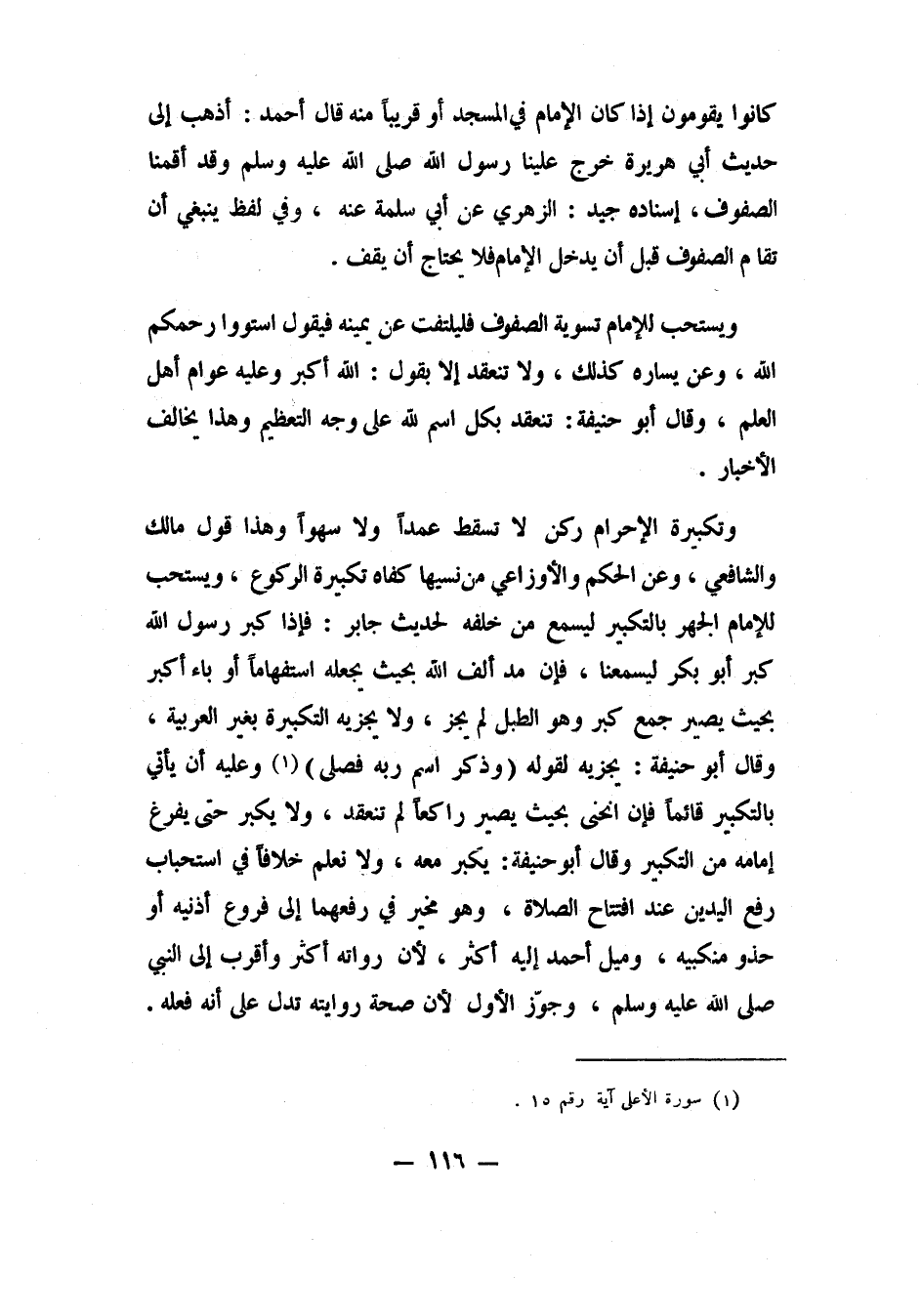 ويستحب للإمام تسوية الصفوف، فليلتفت عن يمينه فيقول: استووا رحمكم الله، وعن يساره كذلك. ولا تنعقد إلا بقول: "الله أكبر"، وعليه عوام أهل العلم. وقال أبو حنيفة: تنعقد بكل اسم لله على وجه التعظيم، وهذا يخالف الأخبار.