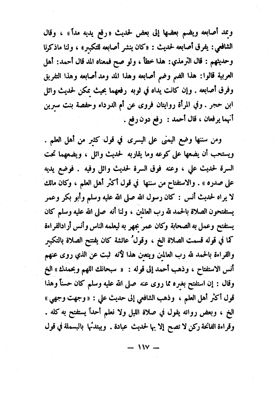 والاستفتاح من سننها في قول أكثر أهل العلم. وكان مالك لا يراه، لحديث أنس: "كان رسول الله صلى الله عليه وسلم وأبو بكر وعمر يستفتحون الصلاة بـ {الْحَمْدُ لِلَّهِ رَبِّ الْعَالَمِينَ} ". ولنا: "أنه صلى الله عليه وسلم كان يستفتح"، وعمل به الصحابة. و"كان عمر يجهر به ليعلمه الناس". و"أنس أراد القراءة كما في قوله: قسمت الصلاة ... إلخ"، وقولُ عائشة: "كان يفتتح الصلاة بالتكبير والقراءة بـ {الْحَمْدُ لِلَّهِ رَبِّ الْعَالَمِينَ} ". 1 ويتعين هذا لأنه ثبت عن الذي روى عنهم أنس الاستفتاح. وذهب أحمد إلى قوله: "سبحانك اللهم وبحمدك. .. إلخ"، 2 وقال: إن استفتح بغيره مما روي عنه صلى الله عليه وسلم كان حسناً؛ وهذا قول أكثر أهل العلم. وذهب الشافعي إلى حديث علي: "وجهت وجهي ... إلخ"، وبعض رواته يقول في صلاة الليل، ولا نعلم أحدًا يستفتح به كله. وقراءة "الفاتحة" ركن لا تصح إلا بها لحديث عبادة.