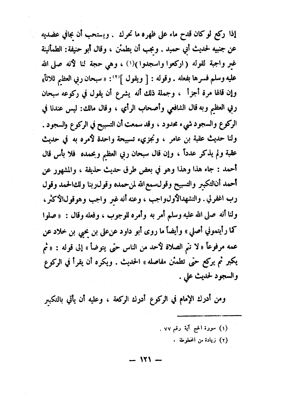 "إذا ركع، لو كان قدح ماء على ظهره ما تحرك". ويستحب أن يجافي عضديه عن جنبيه، لحديث أبي حميد. ويجب أن يطمئن، وقال أبو حنيفة: الطمأنينة غير واجبة، لقوله: {ارْكَعُوا وَاسْجُدُوا} ، 1 وهي حجة لنا لأنه صلى الله عليه وسلم فسرها بفعله.