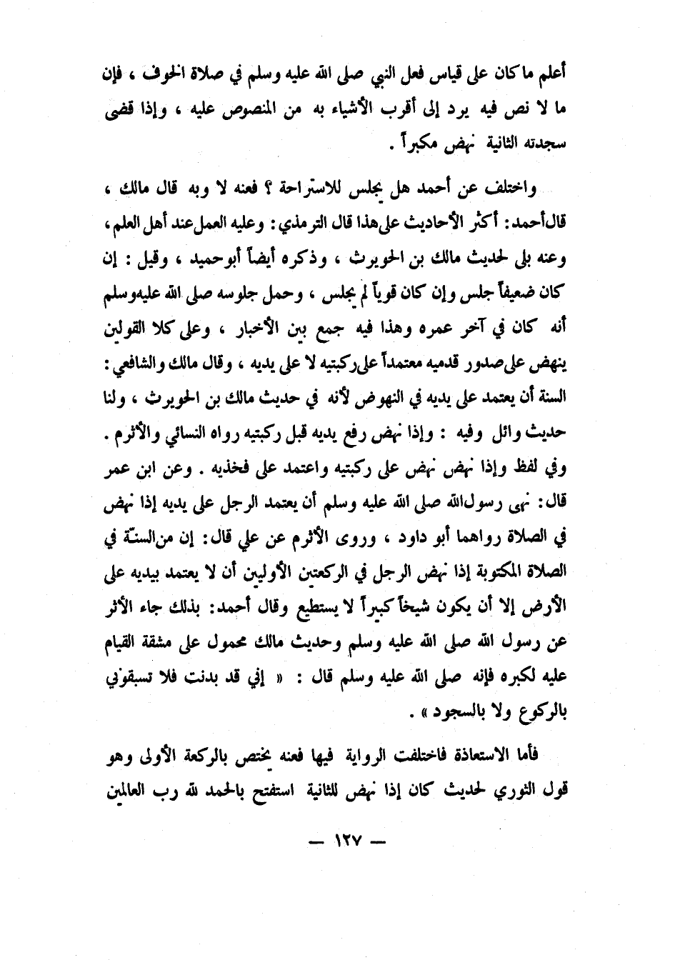 واختلف عن أحمد هل يجلس للاستراحة؟ فعنه: لا، وبه قال مالك. قال أحمد: أكثر الأحاديث على هذا، قال الترمذي: وعليه العمل عند أهل العلم. وعنه: بلى، لحديث مالك بن الحويرث، وذكره أيضاً أبو حميد. وقيل: إن كان ضعيفاً جلس، وإن كان قوياً لم يجلس، وحمل جلوسه صلى الله عليه وسلم أنه كان في آخر عمره، وهذا فيه جمع بين الأخبار. وعلى كلا القولين، ينهض على صدور قدميه معتمداً على ركبتيه لا على يديه. وقال مالك والشافعي: السنة أن يعتمد على يديه في النهوض، لأنه في حديث مالك بن الحويرث. ولنا: حديث وائل، وفيه: "وإذا نهض رفع يديه قبل ركبتيه". 1. رواه النسائي والأثرم. وفي لفظ: "وإذا نهض نهض على ركبتيه، واعتمد على فخذيه"، 2 وعن ابن عمر قال: "نهى رسول الله صلى الله عليه وسلم أن يعتمد الرجل على يديه إذا نهض في الصلاة". 3 رواهما أبو داود. وروى الأثرم عن علي قال: "إن من السنّة في الصلاة المكتوبة إذا نهض الرجل في الركعتين الأوليين أن لا يعتمد بيديه على الأرض، إلا أن يكون شيخاً كبيراً لا يستطيع". وقال أحمد: بذلك جاء الأثر عن رسول الله صلى الله عليه وسلم، وحديث مالك محمول على مشقة القيام عليه لكبره، فإنه صلى الله عليه وسلم قال: " إني قد بدنت، فلا تسبقوني بالركوع ولا بالسجود ". 4