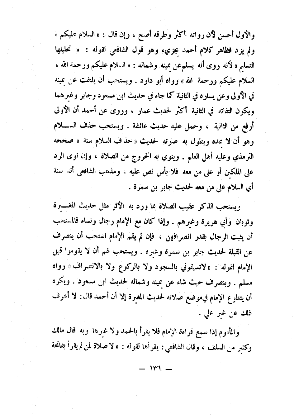 والأول أحسن، لأن رواته أكثر وطرقه أصح. وإن قال: "السلام عليكم" ولم يزد، فظاهر كلام أحمد: يجزئ، وهو قول الشافعي، لقوله: "تحليلها التسليم"، لأنه روي أنه يسلم عن يمينه وشماله: "السلام عليكم ورحمة الله، السلام عليكم ورحمة الله". 1 رواه أبو داود.