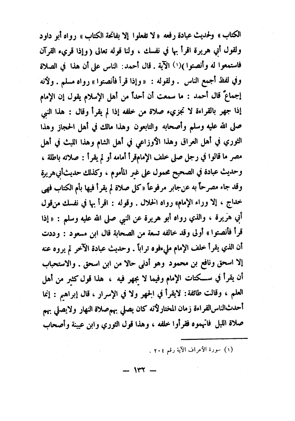 الكتاب"، 1 ولحديث عبادة، رفعه: "لا تفعلوا إلا بفاتحة الكتاب"، 2 رواه أبو داود، ولقول أبي هريرة: "إقرأ بها في نفسك". ولنا: قوله تعالى: {وَإِذَا قُرِئَ الْقُرْآنُ فَاسْتَمِعُوا لَهُ وَأَنْصِتُوا} الآية 3، قال أحمد: الناس على أن هذا في الصلاة، وفي لفظ: أجمع الناس، ولقوله صلى الله عليه وسلم: "وإذا قرأ فأنصتوا"، 4 رواه مسلم، ولأنه إجماعٌ، قال أحمد: ما سمعت أن أحداً من أهل الإسلام يقول: إن الإمام إذا جهر بالقراءة لا تجزئ صلاة من خلفه إذا لم يقرأ. وقال: هذا النبي صلى الله عليه وسلم وأصحابه والتابعون، وهذا مالك في أهل الحجاز، وهذا الثوري في أهل العراق، وهذا الأوزاعي في أهل الشام، وهذا الليث في أهل مصر، ما قالوا في رجل صلى خلف الإمام قرأ إمامه أو لم يقرأ: صلاته باطلة، وحديث عبادة في الصحيح محمول على غير المأموم، وكذلك حديث أبي هريرة، وقد جاء مصرحاً به عن جابر، مرفوعاً: "كل صلاة لم يقرأ فيها بأم الكتاب فهي خداج، إلا وراء الإمام". رواه الخلال. وقوله: "اقرأ بها في نفسك" من قول أبي هريرة، والذي رواه أبو هريرة عن النبي صلى الله عليه وسلم: "إذا قرأ فأنصتوا " 5 أولى، وقد خالفه تسعة من الصحابة، قال ابن مسعود: "وددت أن الذي يقرأ خلف الإمام مُلئ فوه تراباً"، وحديث عبادة الآخر لم يروه عنه إلا إسحاق ونافع بن محمود، وهو أدنى حالاً من ابن إسحاق. والاستحباب: أن يقرأ في سكتات الإمام، وفيما لا يجهر فيه؛ هذا قول كثير من أهل العلم. وقالت طائفة: لا يقرأ في الجهر ولا في الإسرار. قال إبراهيم: إنما أحدث الناس القراءة زمان المختار، لأنه كان يصلي بهم صلاة النهار ولا يصلي بهم صلاة الليل، فاتهموه فقرؤوا خلفه، وهذا قول الثوري وابن عيينة وأصحاب