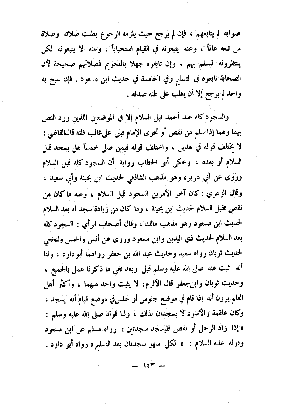 والسجود كله عند أحمد قبل السلام، إلا في الموضعين اللذيْن ورد النص بهما، وهما: إذا سلم من نقص، أو تحرى الإمام فبنى على غالب ظنه. قال القاضي: لا يختلف قوله في هذين، واختلف قوله فيمن صلى خمساً هل يسجد قبل السلام أو بعده؟ وحكى أبو الخطاب رواية: "أن السجود كله قبل السلام"، وروي عن أبي هريرة؛ وهو مذهب الشافعي، لحديث ابن بحينة وأبي سعيد. وقال الزهري: كان آخر الأمرين السجود قبل السلام. وعنه: "ما كان من نقص فقبل السلام"، لحديث ابن بحينة، و "ما كان من زيادة سجد له بعد السلام"، لحديث ابن مسعود؛ وهو مذهب مالك. وقال أصحاب الرأي: "السجود كله بعد السلام"، لحديث ذي اليدين وابن مسعود. وروي عن أنس والحسن والنخعي، لحديث ثوبان رواه سعيد وحديث عبد الله بن جعفر، رواهما أبو داود. ولنا: "أنه ثبت عنه صلى الله عليه وسلم قبل وبعد"، ففي ما ذكرنا عمل بالجميع، وحديث ثوبان وابن جعفر قال الأثرم: لا يثبت واحد منهما، وأكثر أهل العلم يرون أنه إذا قام في موضع جلوس أو جلس في موضع قيام، أنه يسجد. وكان علقمة والأسود لا يسجدان لذلك. ولنا: قوله صلى الله عليه وسلم: "إذا زاد الرجل أو نقص فليسجد سجدتين". 1 رواه مسلم عن ابن مسعود، وقوله عليه السلام: "لكل سهو سجدتان بعد التسليم". 2 رواه أبو داود.