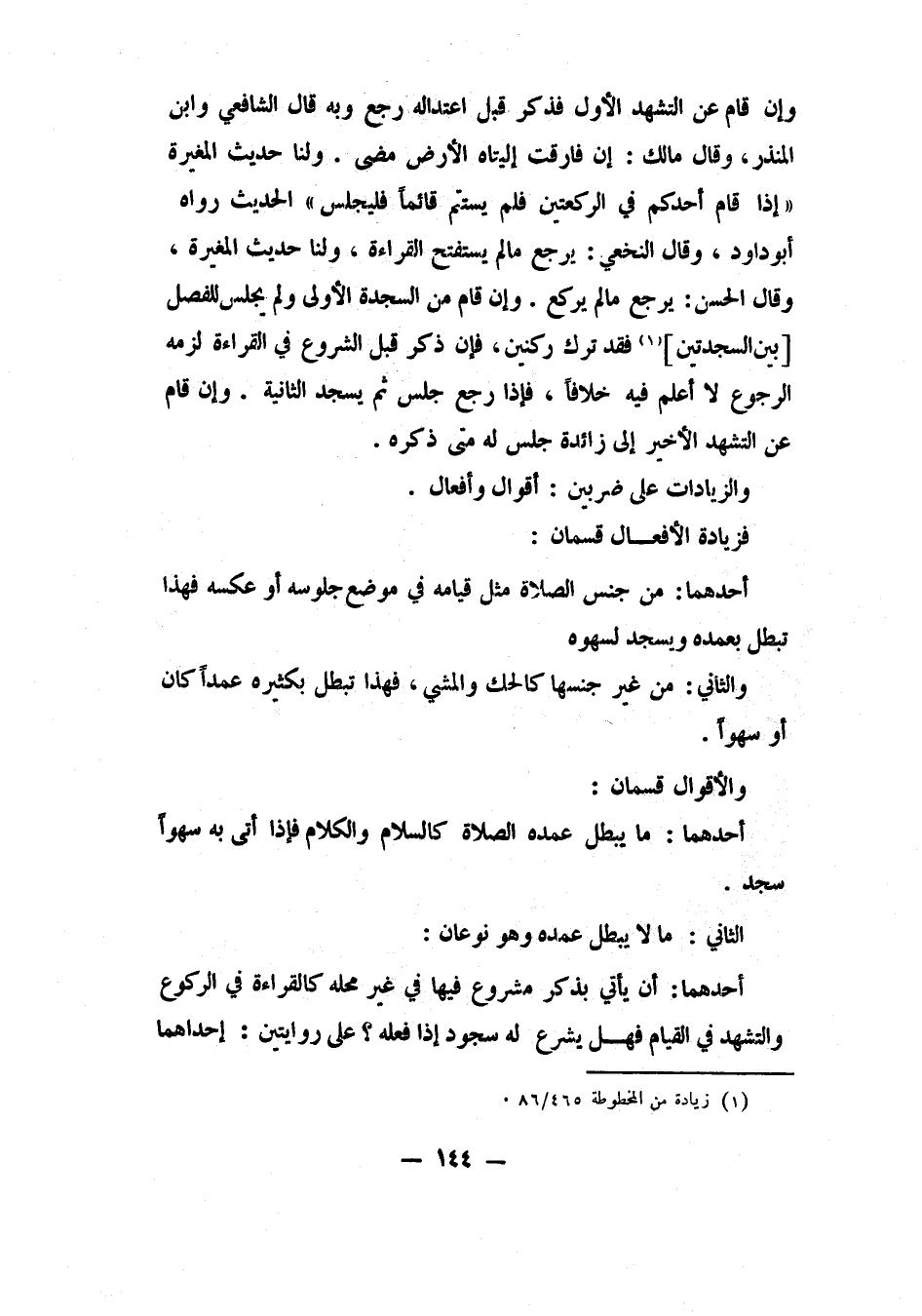 الثاني: ما لا يبطل عمده، وهو نوعان: أحدهما: أن يأتي بذكر مشروع فيها في غير محله، كالقراءة في الركوع والتشهد في القيام، فهل يشرع له سجود إذا فعله؟ على روايتين: إحداهما: