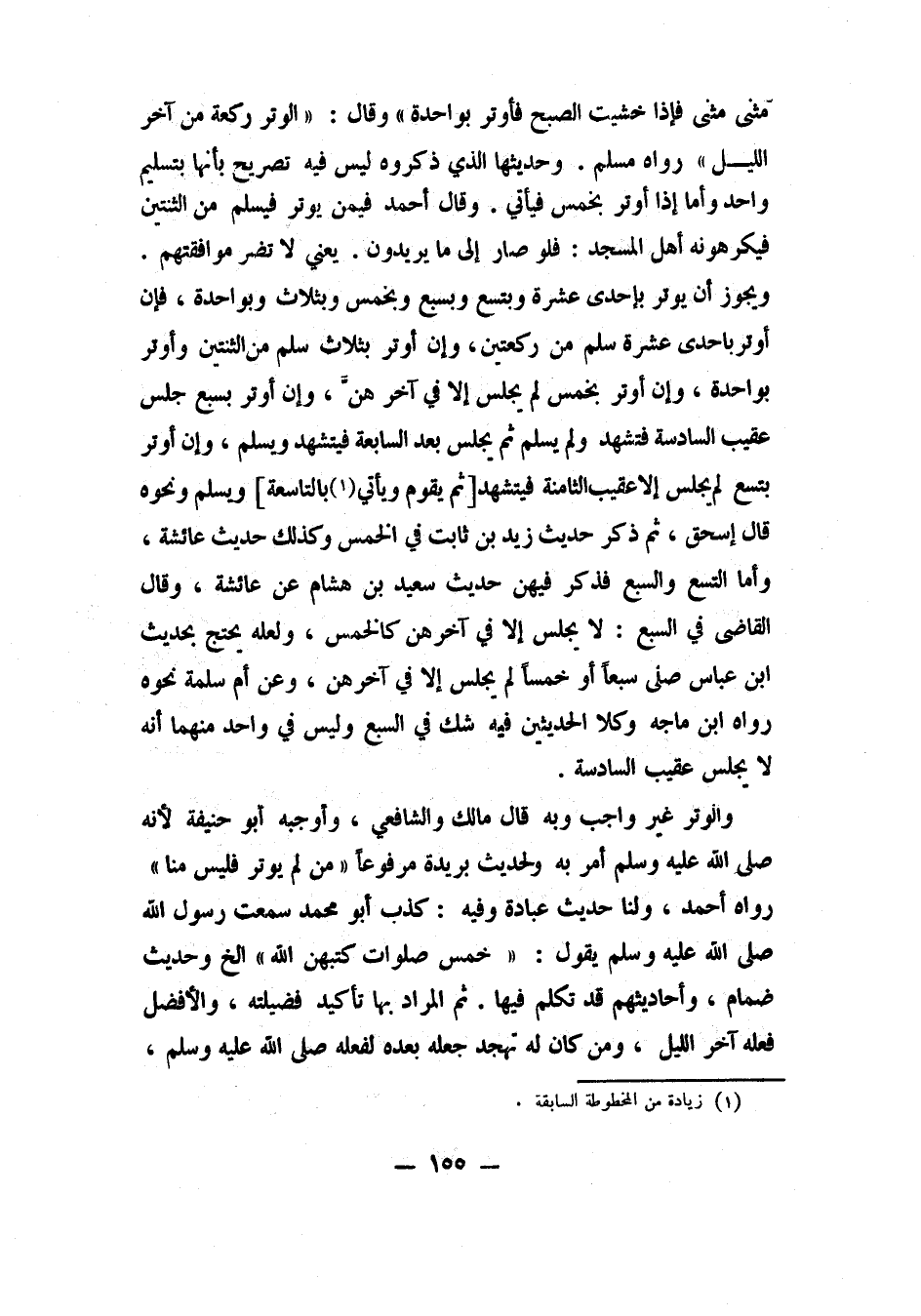 والوتر غير واجب، وبه قال مالك والشافعي، وأوجبه أبو حنيفة، لأنه صلى الله عليه وسلم أمر به، ولحديث بريدة، مرفوعاً: "من لم يوتر فليس منا". 4 رواه أحمد. ولنا: حديث عبادة، وفيه: كذب أبو محمد، سمعت رسول الله صلى الله عليه وسلم يقول: "خمس صلوات كتبهن الله ... إلخ"، 5 وحديث ضمام، وأحاديثهم قد تكلم فيها. ثم المراد بها تأكيد فضيلته، والأفضل فعله آخر الليل. و"من كان له تهجد، جعله بعده، لفعله صلى الله عليه وسلم".
