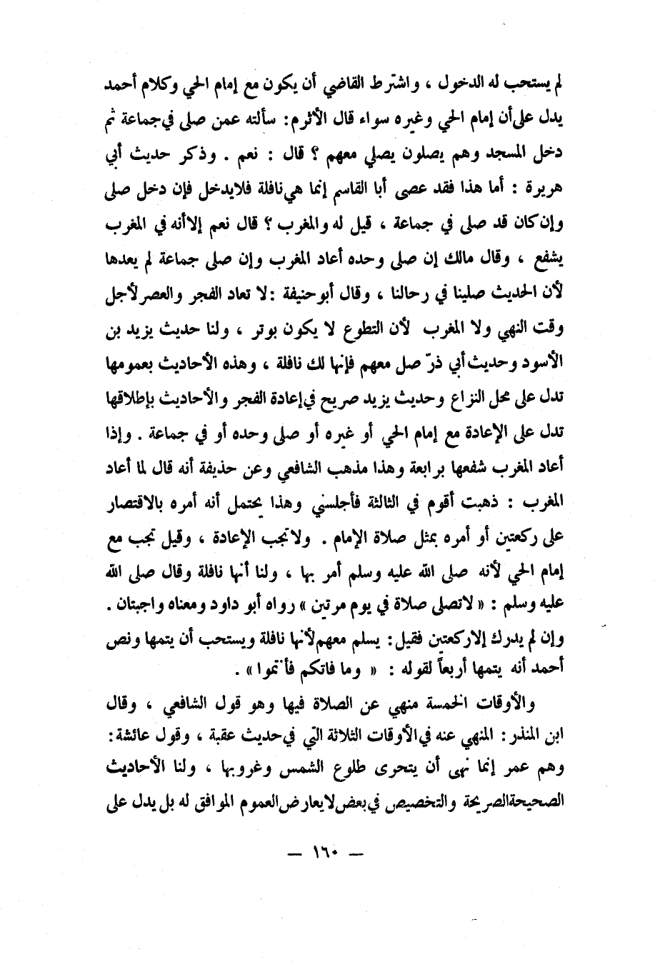 وإن لم يدرك إلا ركعتين، فقيل: يسلم معهم، لأنها نافلة، ويستحب أن يتمها. ونص أحمد أنه يتمها أربعاً، لقوله: "وما فاتكم فأتموا ". 2 والأوقات الخمسة منهي عن الصلاة فيها، وهو قول الشافعي. وقال ابن المنذر: المنهي عنه في الأوقات الثلاثة التي في حديث عقبة، وقول عائشة: "وهم عمر، إنما نهى أن يتحرى طلوع الشمس وغروبها". 3 ولنا: الأحاديث الصحيحة االصريحة، والتخصيص في بعض لا يعارض العموم الموافق له، بل يدل على