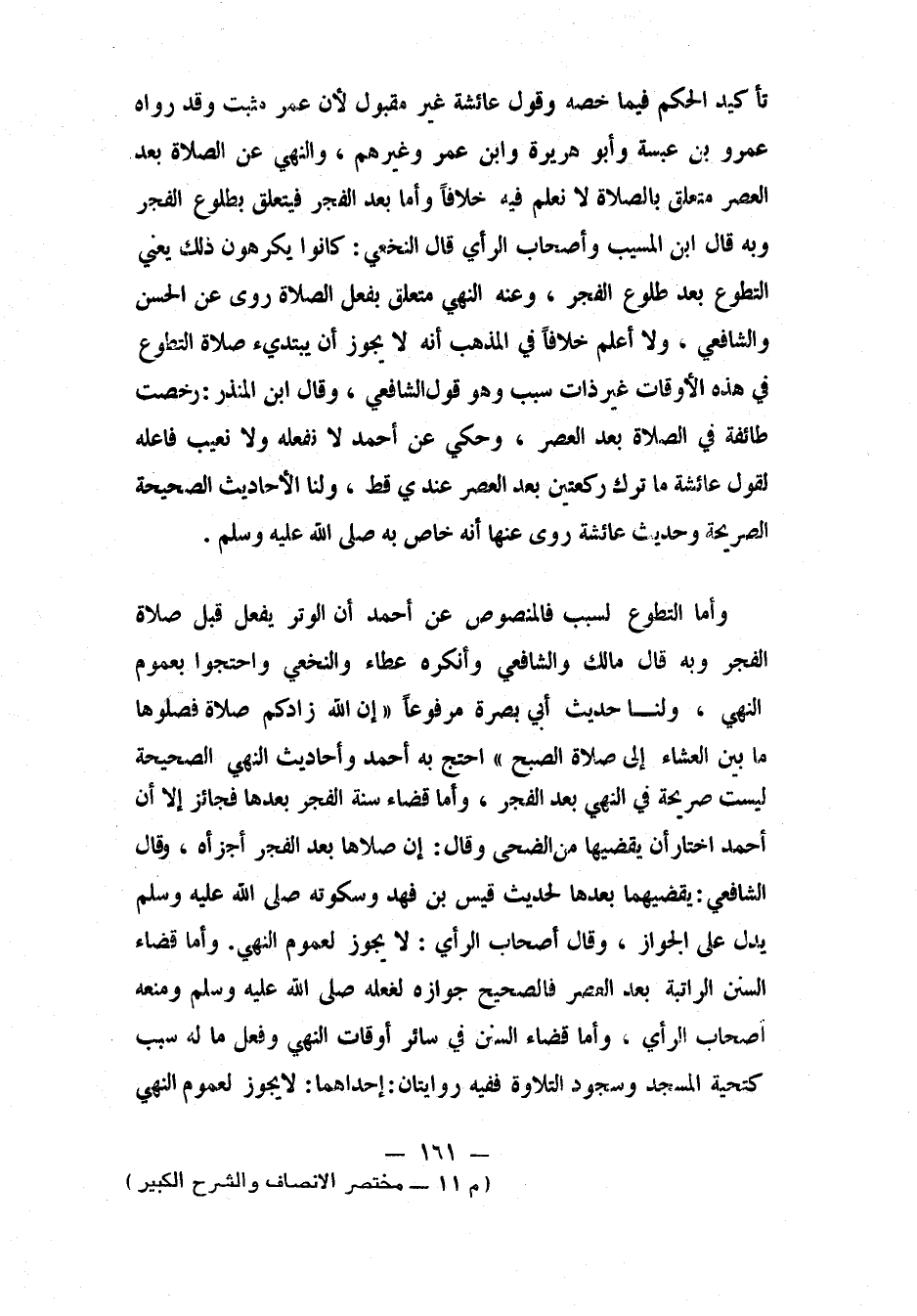 وأما التطوع لسبب، فالمنصوص عن أحمد: أن الوتر يفعل قبل صلاة الفجر، وبه قال مالك والشافعي، وأنكره عطاء والنخعي، واحتجوا بعموم النهي. ولنا: حديث أبي بصرة، مرفوعاً: " إن الله زادكم صلاة، فصلوها ما بين العشاء إلى صلاة الصبح ". 2 احتج به أحمد. وأحاديث النهي الصحيحة ليست صريحة في النهي بعد الفجر.