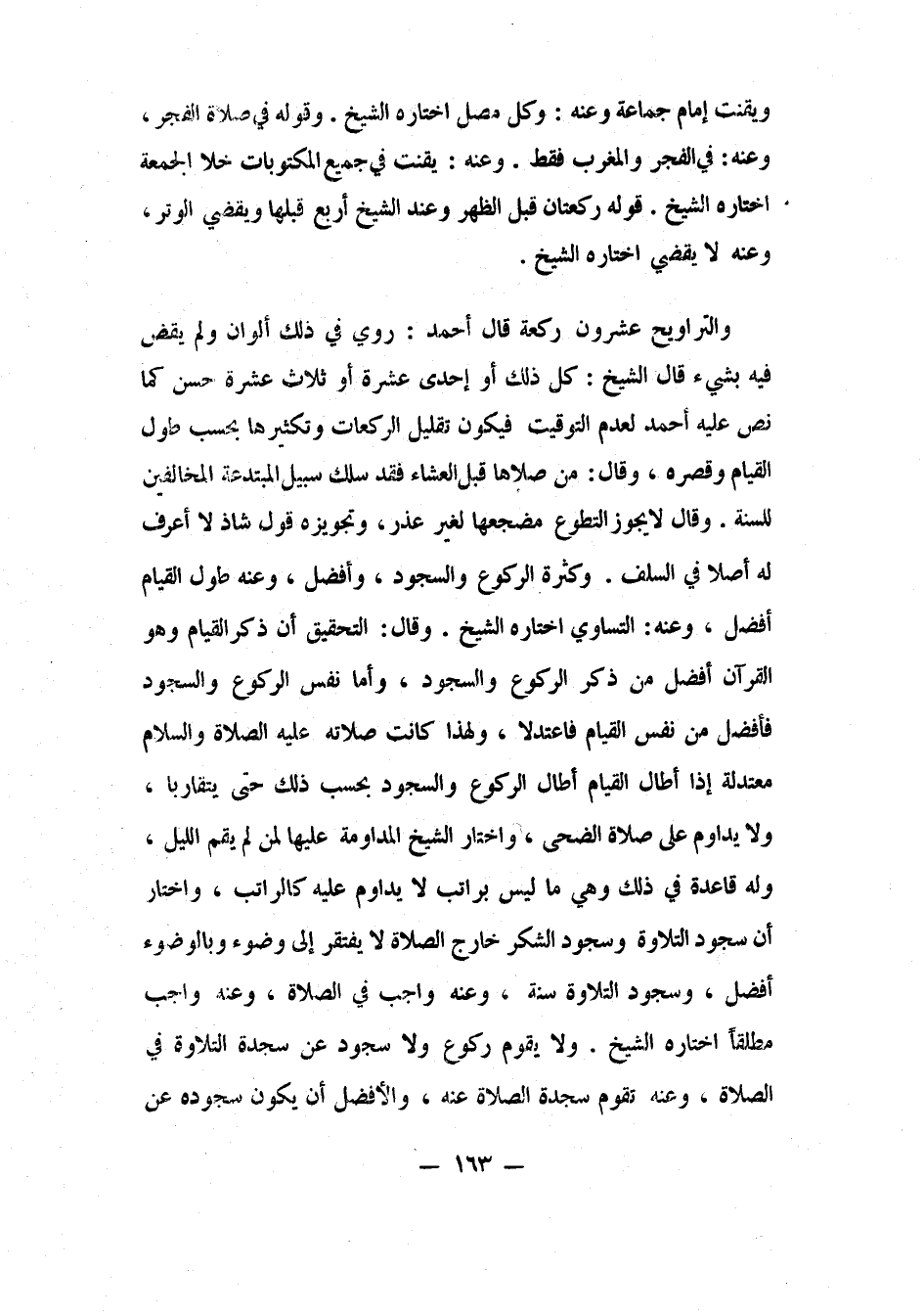 وكثرة الركوع والسجود أفضل، وعنه: طول القيام أفضل، وعنه: التساوي، اختاره الشيخ. وقال: التحقيق أن ذكر القيام وهو القرآن، أفضل من ذكر الركوع والسجود، وأما نفس الركوع والسجود فأفضل من نفس القيام، فاعتدلا؛ ولهذا كانت صلاته عليه الصلاة والسلام معتدلة: إذا أطال القيام أطال الركوع والسجود بحسب ذلك حتى يتقاربا. ولا يداوم على صلاة الضحى، واختار الشيخ المداومة عليها لمن لم يقم الليل؛ وله قاعدة في ذلك وهي: ما ليس براتب لا يداوم عليه كالراتب. واختار أن سجود التلاوة وسجود الشكر خارج الصلاة لا يفتقر إلى وضوء، وبالوضوء أفضل. وسجود التلاوة سنة، وعنه: واجب في الصلاة، وعنه: واجب مطلقاً، اختاره الشيخ.