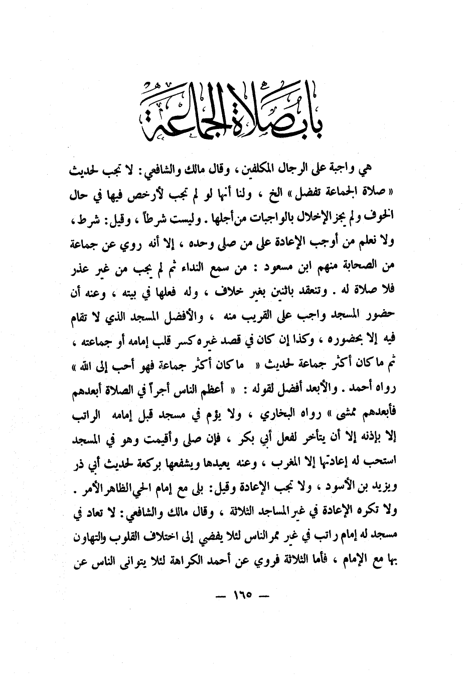 هي: واجبة على الرجال المكلفين، وقال مالك والشافعي: لا تجب لحديث: "صلاة الجماعة تفضل ... إلخ". 1 ولنا: أنها لو لم تجب لأرخص فيها في حال الخوف، ولم يجز الإخلال بالواجبات من أجلها. وليست شرطاً، وقيل: شرط. ولا نعلم من أوجب الإعادة على من صلى وحده، إلا أنه روي عن جماعة من الصحابة منهم ابن مسعود: "من سمع النداء ثم لم يجب من غير عذر، فلا صلاة له". وتنعقد باثنين بغير خلاف. وله فعلها في بيته، وعنه: أن حضور المسجد واجب على القريب منه، والأفضل المسجد الذي لا تقام فيه إلا بحضوره، وكذا إن كان في قصد غيره كسر قلب إمامه أو جماعته، ثم ما كان أكثر جماعة، لحديث: "ما كان أكثر جماعة، فهو أحب إلى الله". 2 رواه أحمد. والأبعد أفضل، لقوله: "أعظم الناس أجراً في الصلاة: أبعدهم فأبعدهم ممشى". 3 رواه البخاري. ولا يؤم في مسجد قبل إمامه الراتب إلا بإذنه، إلا أن يتأخر، لفعل أبي بكر. فإن صلى وأقيمت وهو في المسجد، استحب له إعادتها، إلا المغرب، وعنه: يعيدها ويشفعها بركعة، لحديث أبي ذر ويزيد بن الأسود. ولا تجب الإعادة، وقيل: بلى، مع إمام الحي الظاهر الأمر. ولا تكره الإعادة في غير المساجد الثلاثة. وقال مالك والشافعي: لا تعاد في مسجد له إمام راتب في غير ممر الناس، لئلا يفضي إلى اختلاف القلوب والتهاون بها مع الإمام. فأما الثلاثة، فروي عن أحمد الكراهة، لئلا يتوانى الناس عن