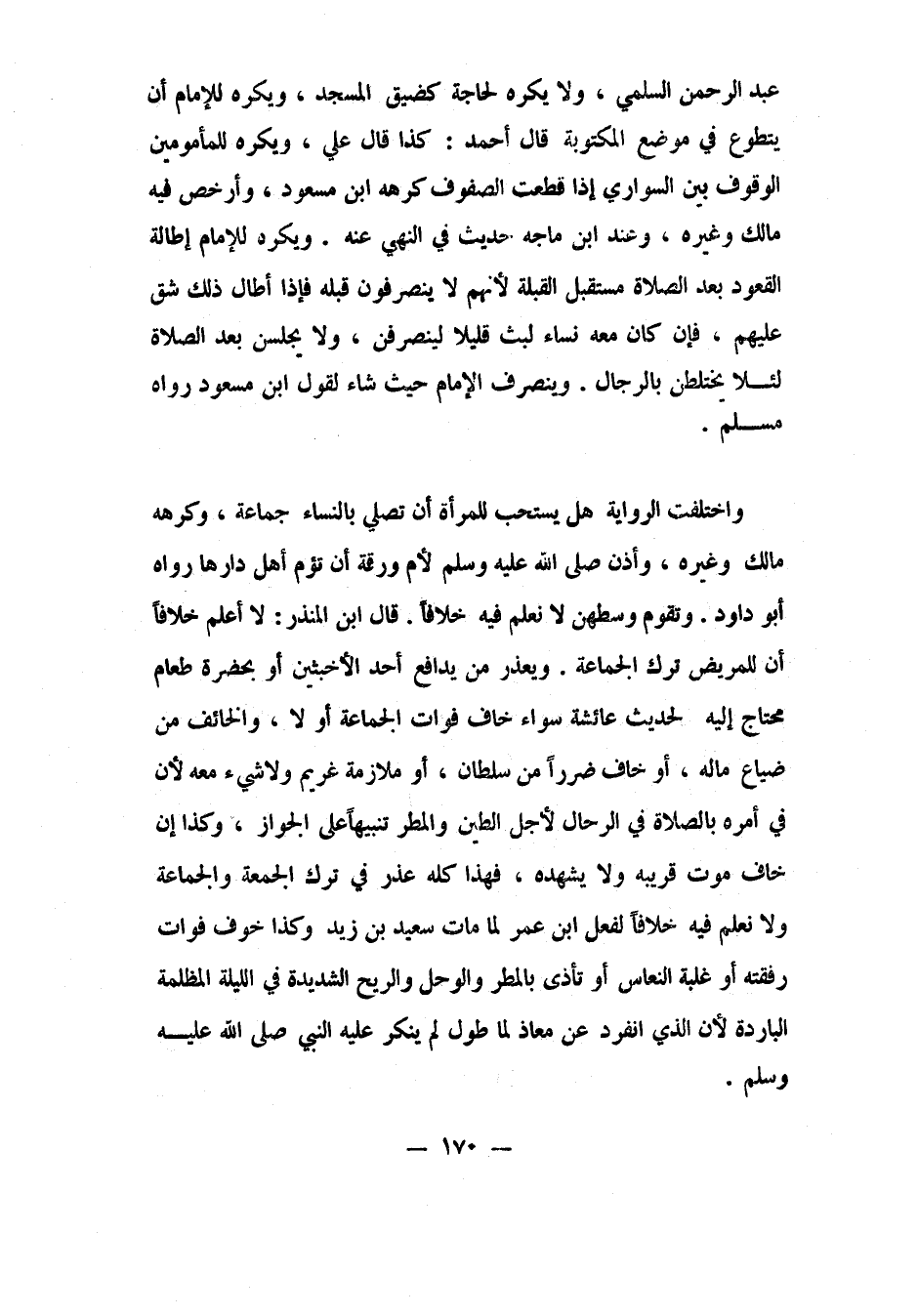 عبد الرحمن السلمي. ولا يكره لحاجة، كضيق المسجد. و"يكره للإمام أن يتطوع في موضع المكتوبة"، قال أحمد: كذا قال علي. ويكره للمأمومين الوقوف بين السواري إذا قطعت الصفوف، "كرهه ابن مسعود"، وأرخص فيه مالك وغيره. وعند ابن ماجة حديث في النهي عنه.