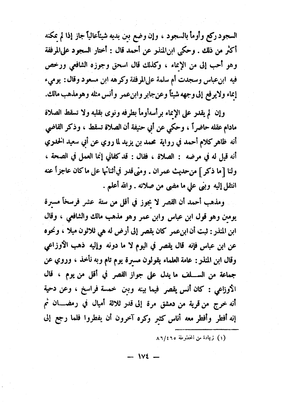 ومذهب أحمد "أن القصر لا يجوز في أقل من ستة عشر فرسخاً، مسيرة يومين"، وهو قول ابن عباس وابن عمر. وهو مذهب مالك والشافعي. وقال ابن المنذر: ثبت: "أن ابن عمر كان يقصر إلى أرض له هي ثلاثون ميلاً"، ونحوه عن ابن عباس، فإنه قال: "يقصر في اليوم، لا ما دونه"؛ وإليه ذهب الأوزاعي. وقال ابن المنذر: عامة العلماء يقولون: مسيرة يوم تام، وبه نأخذ.
