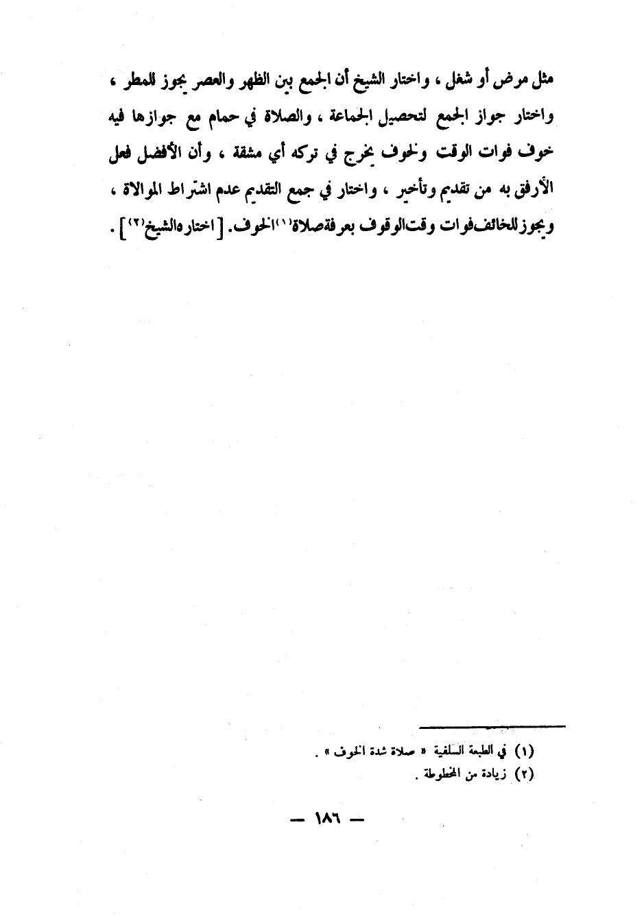 مثل مرض أو شغل، واختار الشيخ أن الجمع بين الظهر والعصر يجوز للمطر. واختار جواز الجمع لتحصيل الجماعة، والصلاة في حمام مع جوازها فيه، خوف فوات الوقت، ولخوف يخرج في تركه أي مشقة، وأن الأفضل: فعل الأرفق به من تقديم وتأخير. واختار في جمع التقديم عدم اشتراط الموالاة. ويجوز للخائف فوات وقت الوقوف بعرفة صلاة 1 الخوف. [اختاره الشيخ 2] .