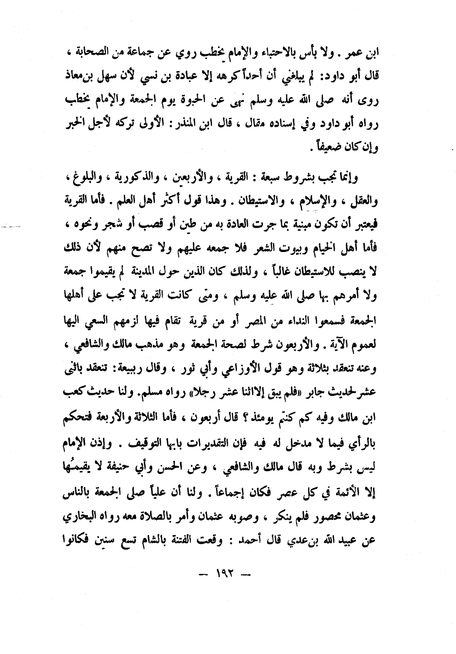 وإنما تجب بشروط سبعة: القرية، والأربعين، والذكورية، والبلوغ، والعقل، والإسلام، والاستيطان. وهذا قول أكثر أهل العلم.