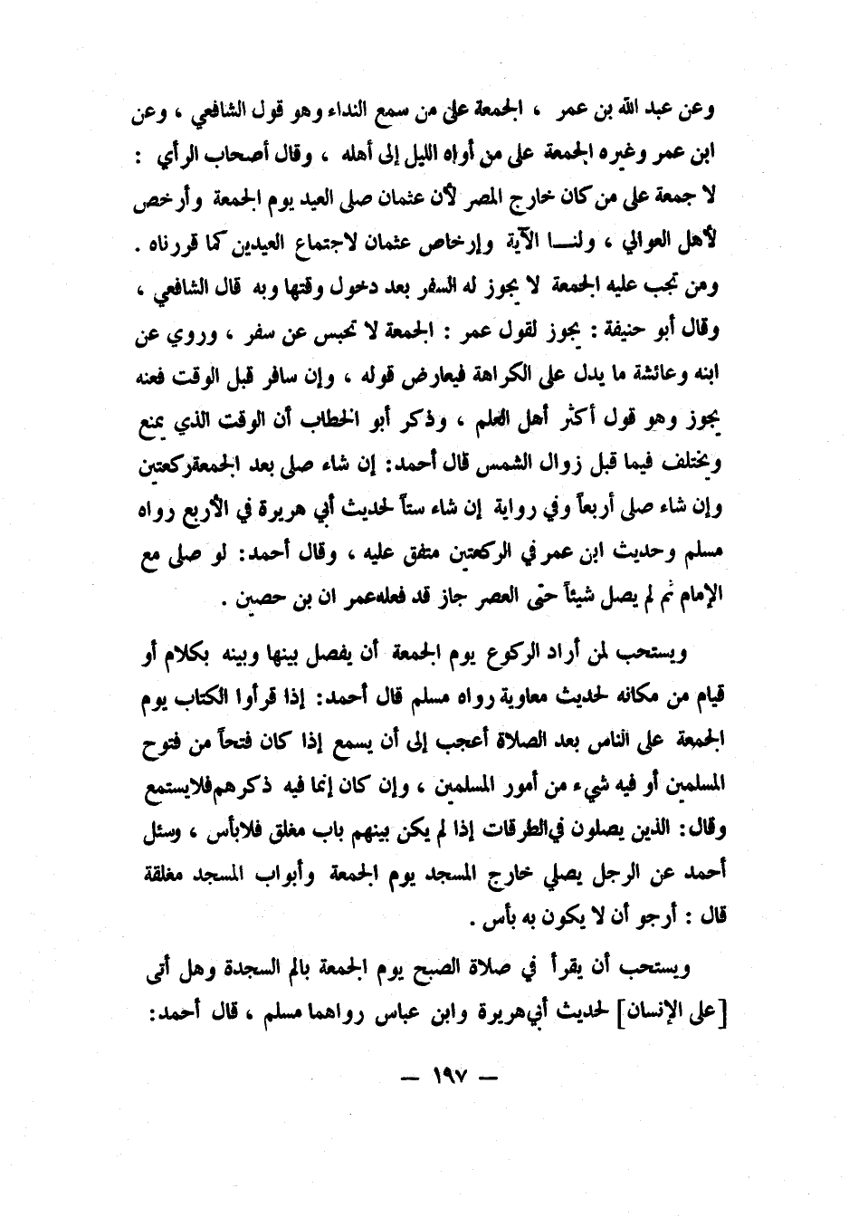 و"يستحب أن يقرأ في صلاة الصبح يوم الجمعة بـ"الم السجدة" و"هل أتى [على الإنسان] ""، لحديث أبي هريرة وابن عباس، رواهما مسلم. قال أحمد: