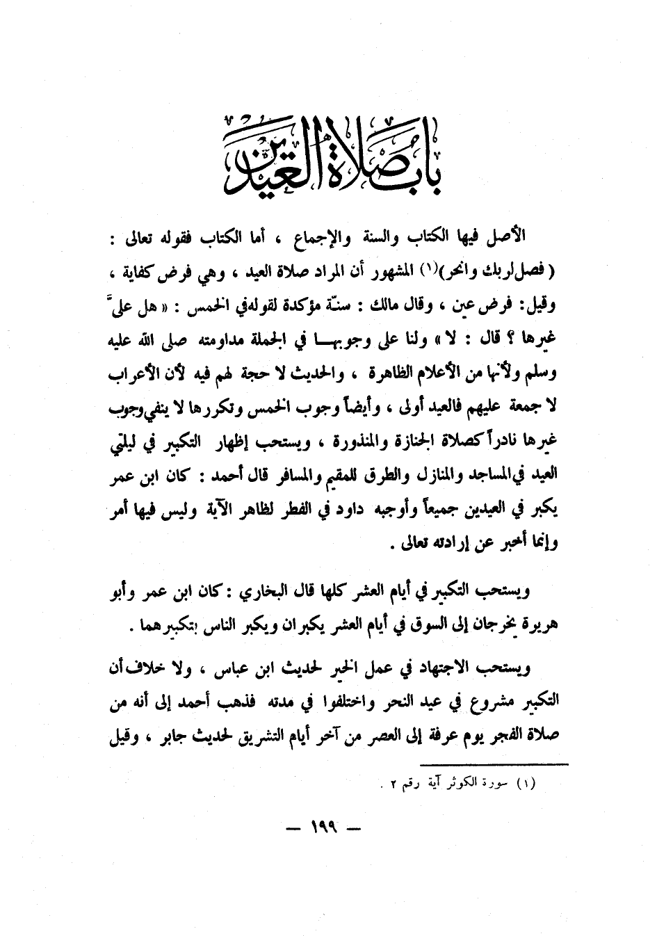 الأصل فيها: الكتاب والسنة والإجماع. أما الكتاب، فقوله تعالى: {فصل لربك وانحر} ، 1 المشهور: أن المراد: صلاة العيد، وهي فرض كفاية، وقيل: فرض عين. وقال مالك: سنّة مؤكدة، لقوله في الخمس: "هل عليَّ غيرها؟ قال: لا". 2 ولنا على وجوبها في الجملة: مداومته صلى الله عليه وسلم، ولأنها من الأعلام الظاهرة، والحديث لا حجة لهم فيه، لأن الأعراب لا جمعة عليهم، فالعيد أولى، وأيضاً وجوب الخمس وتكررها لا ينفي وجوب غيرها نادراً، كصلاة الجنازة والمنذورة.