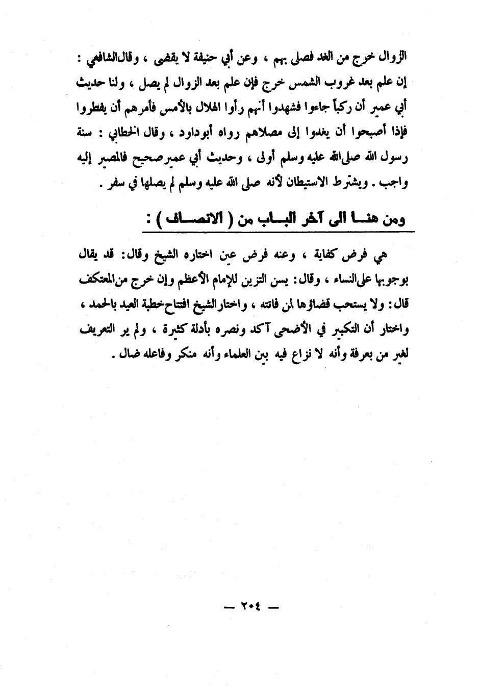 الزوال، خرج من الغد فصلى بهم. وعن أبي حنيفة: لا يقضي. وقال الشافعي إن علم بعد غروب الشمس خرج، فإن علم بعد الزوال لم يصل. ولنا: حديث أبي عمير: "أن ركباً جاؤوا فشهدوا أنهم رأوا الهلال بالأمس، فأمرهم أن يفطروا، فإذا أصبحوا أن يغدوا إلى مصلاهم". رواه أبو داود، وقال الخطابي: سنة رسول الله صلى الله عليه وسلم أولى، وحديث أبي عمير صحيح، فالمصير إليه واجب. ويشترط الاستيطان "لأنه صلى الله عليه وسلم لم يصلّها في سفر".