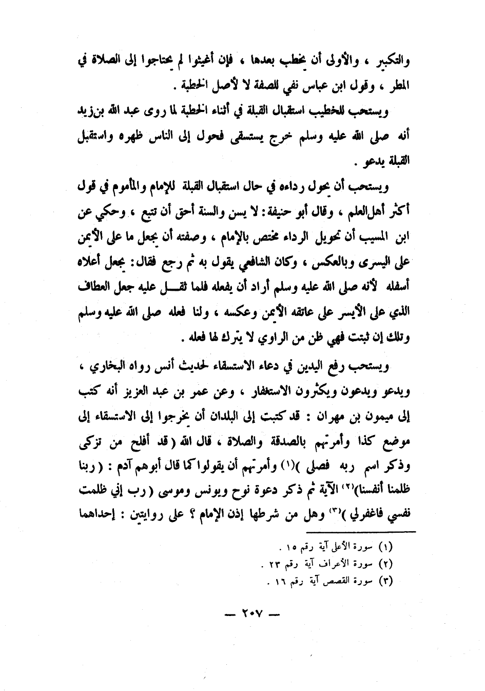 و"يستحب رفع اليدين في دعاء الاستسقاء"، لحديث أنس، رواه البخاري، ويدعو ويدعون ويكثرون الاستغفار. وعن عمر بن عبد العزيز أنه كتب إلى ميمون بن مهران: قد كتبت إلى البلدان أن يخرجوا إلى الاستسقاء إلى موضع كذا، وأمرتهم بالصدقة والصلاة، قال الله: {قَدْ أَفْلَحَ مَنْ تَزَكَّى وَذَكَرَ اسْمَ رَبِّهِ فَصَلَّى} ، 2 وأمرتهم أن يقولوا كما قال أبوهم آدم: {رَبَّنَا ظَلَمْنَا أَنْفُسَنَا} الآية. 3 ثم ذكر دعوة نوح ويونس وموسى: {رَبِّ إِنِّي ظَلَمْتُ نَفْسِي فَاغْفِرْ لِي} . 4 وهل من شرطها إذن الإمام؟ على روايتين: إحداهما: