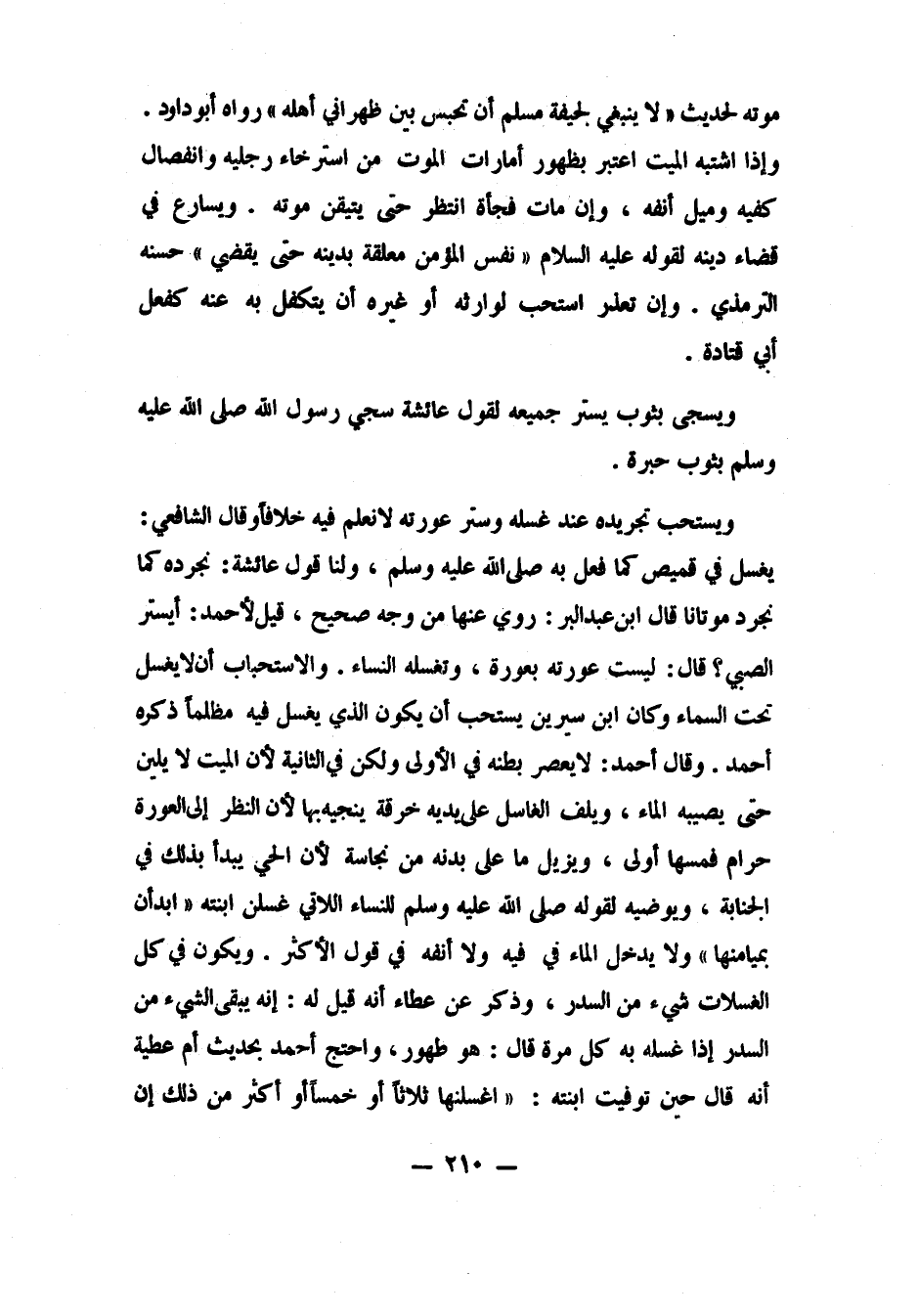 ويسارع في قضاء ديْنه، لقوله عليه السلام: "نفس المؤمن معلقة بديْنه حتى يُقضى". 2 حسنه الترمذي. وإن تعذر استحب لوارثه أو غيره أن يتكفل به عنه، كفعل أبي قتادة. و"يسجى بثوب يستر جميعه"، لقول عائشة: "سُجي رسول الله صلى الله عليه وسلم بثوب حبرة" 3.