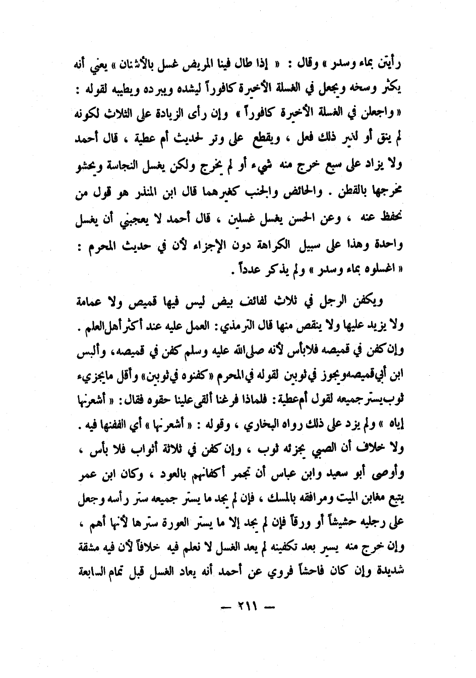 رأيتن، بماء وسدر"، 1 وقال: "إذا طال فينا المريض، غسل بالأشنان"، يعني: أنه يكثر وسخه. ويجعل في الغسلة الأخيرة كافوراً ليشده ويبرده ويطيبه، لقوله: "واجعلن في الغسلة الأخيرة كافوراً". 2 وإن رأى الزيادة على الثلاث، لكونه لم ينق أو لغير ذلك، فعل. ويقطع على وتر، لحديث أم عطية. قال أحمد: ولا يزاد على سبْع، خرج منه شيء أو لم يخرج، ولكن يغسل النجاسة ويحشو مخرجها بالقطن.