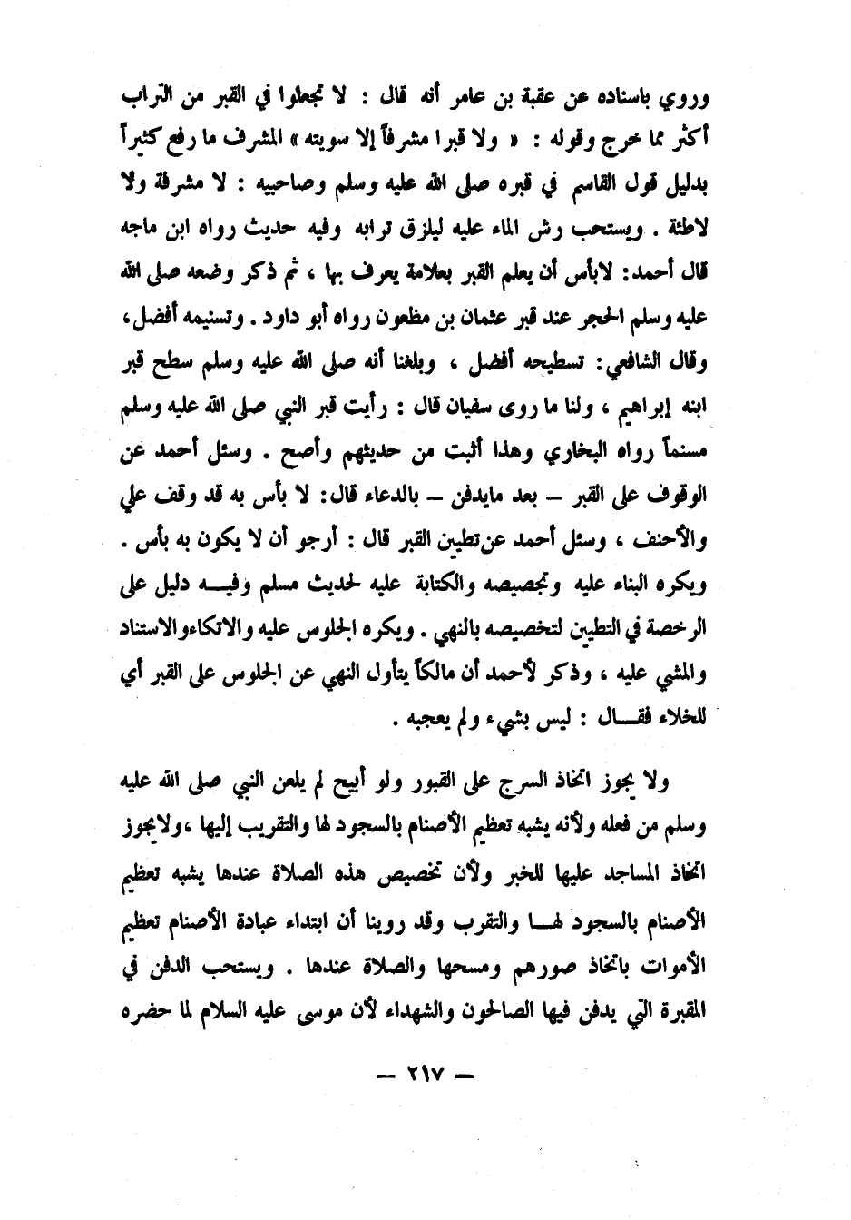 ولا يجوز اتخاذ المساجد عليها، للخبر، ولأن تخصيص هذه الصلاة عندها يشبه تعظيم الأصنام بالسجود لها والتقرب؛ وقد روينا أن ابتداء عبادة الأصنام تعظيم الأموات باتخاذ صورهم ومسحها والصلاة عندها.