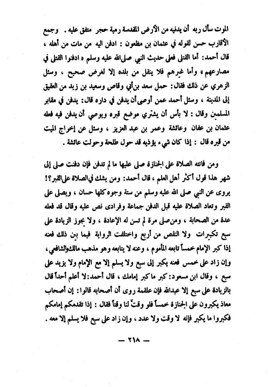 ولا يجوز الزيادة على سبع تكبيرات، ولا النقص من أربع، واختلفت الرواية فيما بين ذلك. فعنه: إذا كبر الإمام خمساً تابعه المأموم. وعنه: لا يتابعه، وهو مذهب مالك والشافعي. وإن زاد على خمس، فعنه: يكبر إلى سبع ولا يسلم إلا مع الإمام، ولا يزيد على سبع. وقال ابن مسعود: "كبر ما كبر إمامك". قال أحمد: لا أعلم أحداً قال بالزيادة على سبع، إلا عبد الله، فإن علقمة روى: "أن أصحابه قالوا: إن أصحاب معاذ يكبرون على الجنازة خمساً، فلو وقّتَّ لنا وقتاً، فقال: إذا تقدمكم إمامكم فكبروا ما يكبر، فإنه لا وقت ولا عدد". وإن زاد على سبع فلا يسلم إلا معه.