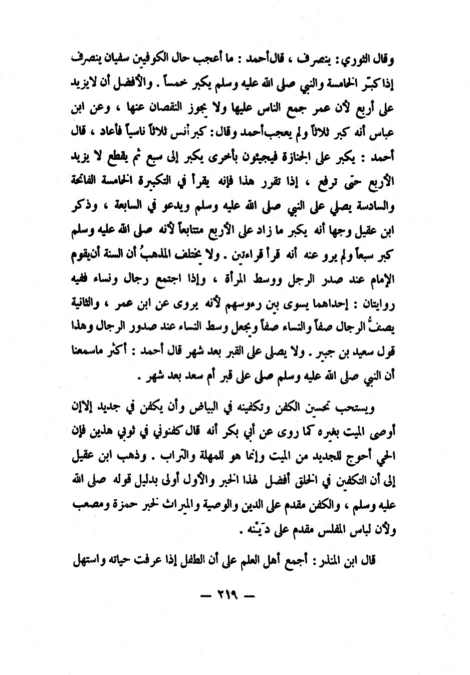 وقال الثوري: ينصرف، قال أحمد: ما أعجب حال الكوفيين، سفيان ينصرف إذا كبّر الخامسة، "والنبي صلى الله عليه وسلم يكبر خمساً! والأفضل أن لا يزيد على أربع، لأن عمر جمع الناس عليها"، ولا يجوز النقصان عنها. وعن ابن عباس: " أنه كبر ثلاثاً". ولم يعجب أحمد، وقال: "كبر أنس ثلاثاً ناسياً، فأعاد".