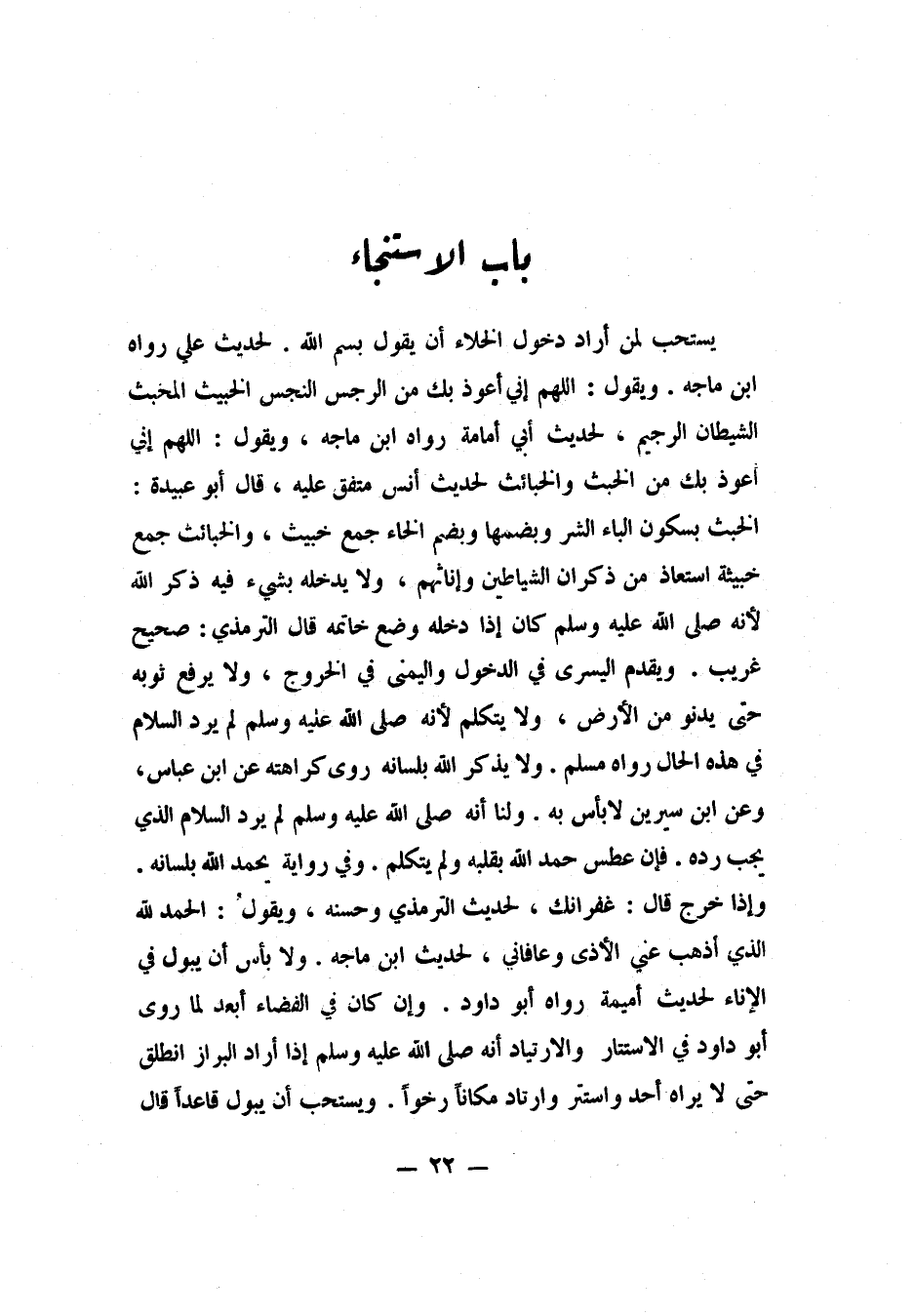 وإذا خرج قال: "غفرانك"، لحديث الترمذي وحسنه، ويقولُ: "الحمد لله الذي أذهب عني الأذى وعافاني"، لحديث ابن ماجة. ولا بأس أن يبول في الإناء، لحديث أميمة، رواه أبو داود.