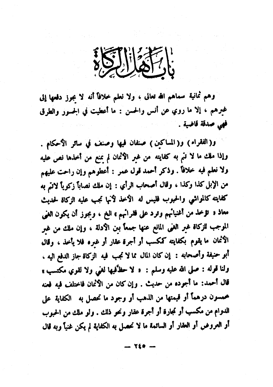 و (الفقراء) و (المساكين) صنفان فيها، وصنف في سائر الأحكام. وإذا ملك ما لا تتم به كفايته من غير الأثمان، لم يمنع من أخذها، نص عليه، ولا نعلم فيه خلافاً. وذكر أحمد قول عمر: "أعطوهم وإن راحت عليهم من الإبل كذا وكذا". وقال أصحاب الرأي: إن ملك نصاباً زكوياً لا تتم به كفايته، كالمواشي والحبوب، فليس له الأخذ، لأنها تجب عليه الزكاة، لحديث معاذ: "تؤخذ من أغنيائهم، وتُرد على فقرائهم ... إلخ". 1 ويجوز أن يكون الغنى الموجب للزكاة غير الغنى المانع عنها، جمعاً بين الأدلة. وإن ملك من غير الأثمان ما يقوم بكفايته، كمكسب أو أجرة عقار أو غيره، فلا يأخذ. وقال أبو حنيفة وأصحابه: إن كان المال مما لا تجب فيه الزكاة، جاز الدفع إليه. ولنا: قوله صلى الله عليه وسلم: "لا حظَّ فيها لغني، ولا لقوي مكتسب". 2 قال أحمد: ما أجوده من حديث! وإن كان من الأثمان فاختلف فيه، فعنه: خمسون درهماً أو قيمتها من الذهب، أو وجود ما تحصل به الكفاية على الدوام، من مكسب أو تجارة أو أجرة عقار ونحو ذلك. ولو ملك من الحبوب أو العروض أو العقار أو السائمة ما لا تحصل به الكفاية، لم يكن غنياً، وبه قال