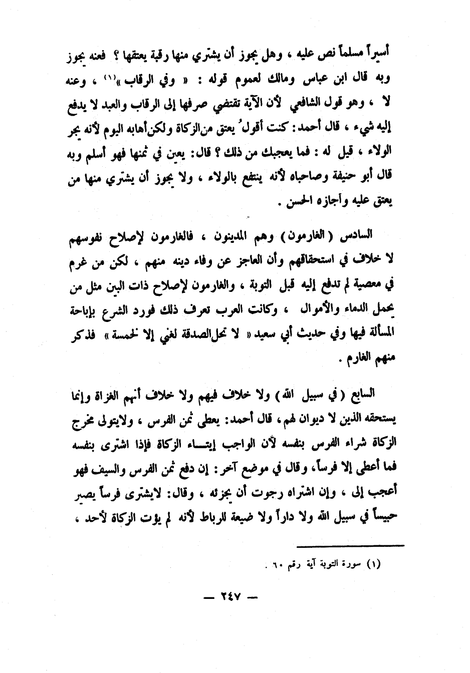 السابع: (في سبيل الله) ، ولا خلاف فيهم، ولا خلاف أنهم الغزاة؛ وإنما يستحقه الذين لا ديوان لهم. قال أحمد: يعطى ثمن الفرس، ولا يتولى مخرج الزكاة شراء الفرس بنفسه، لأن الواجب إيتاء الزكاة؛ فإذا اشترى بنفسه فما أعطي إلا فرساً. وقال في موضع آخر: إن دفع ثمن الفرس والسيف، فهو أعجب إلي، وإن اشتراه رجوت أن يجزئه. وقال: لا يشتري فرساً يصير حبيسا في سبيل الله، ولا دارا ولا ضيعة للرباط، لأنه لم يؤت الزكاة لأحد،