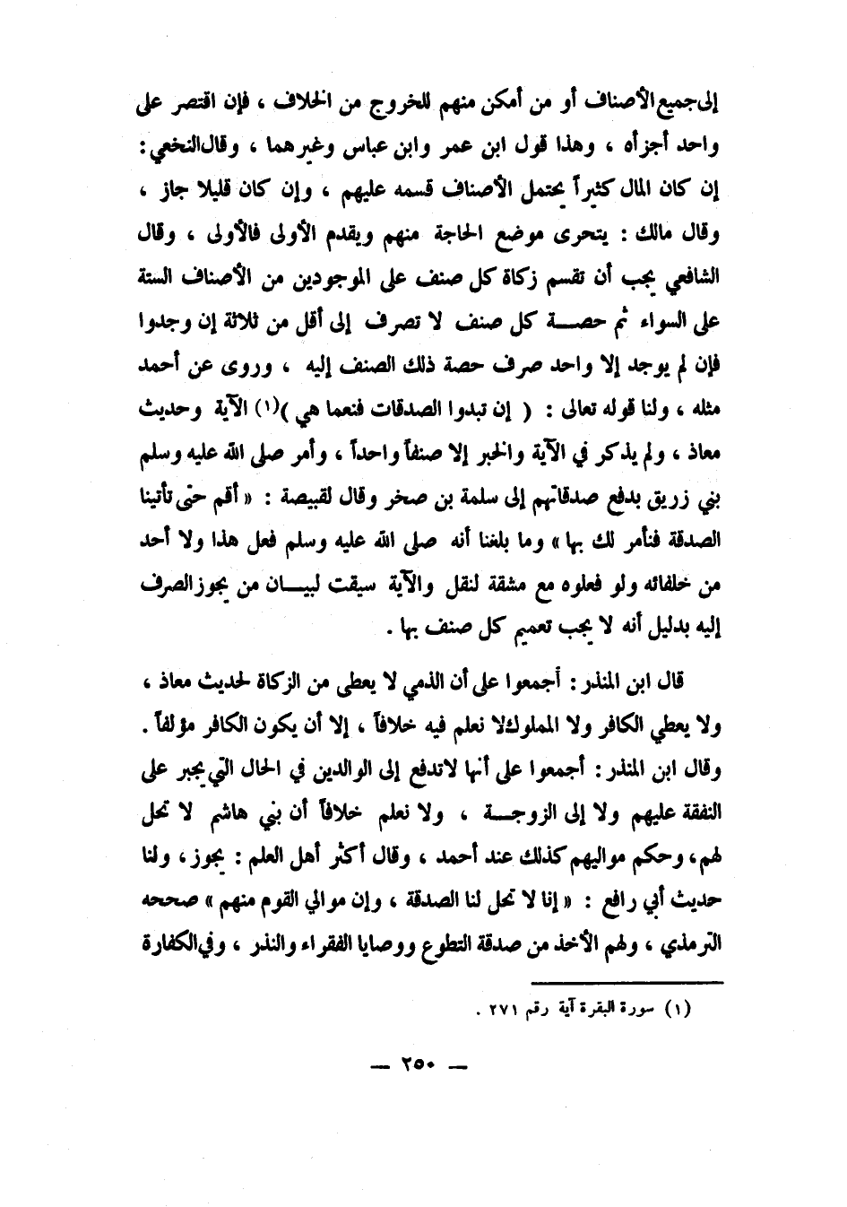 إلى جميع الأصناف، أو من أمكن منهم، للخروج من الخلاف. فـ"إن اقتصر على واحد أجزأه"، وهذا قول ابن عمر وابن عباس وغيرهما. وقال النخعي: إن كان المال كثيراً يحتمل الأصناف، قسمه عليهم، وإن كان قليلاً جاز. وقال مالك: يتحرى موضع الحاجة منهم، ويقدم الأوْلى فالأولى. وقال الشافعي: يجب أن تقسم زكاة كل صنف على الموجودين من الأصناف الستة على السواء، ثم حصة كل صنف لا تصرف إلى أقل من ثلاثة إن وجدوا، فإن لم يوجد إلا واحد، صرف حصة ذلك الصنف إليه. وروي عن أحمد مثله. ولنا: قوله تعالى: {إِنْ تُبْدُوا الصَّدَقَاتِ فَنِعِمَّا هِيَ} الآية، 1 وحديث معاذ؛ ولم يذكر في الآية والخبر إلا صنفاً واحداً. و"أمر صلى الله عليه وسلم بني زريق بدفع صدقاتهم إلى سلمة بن صخر، وقال لقبيصة: أقم حتى تأتينا الصدقة، فنأمر لك بها"، 2 وما بلغنا أنه صلى الله عليه وسلم فعل هذا ولا أحد من خلفائه، ولو فعلوه مع مشقة لنقل. والآية سيقت لبيان من يجوز الصرف إليه، بدليل أنه لا يجب تعميم كل صنف بها.