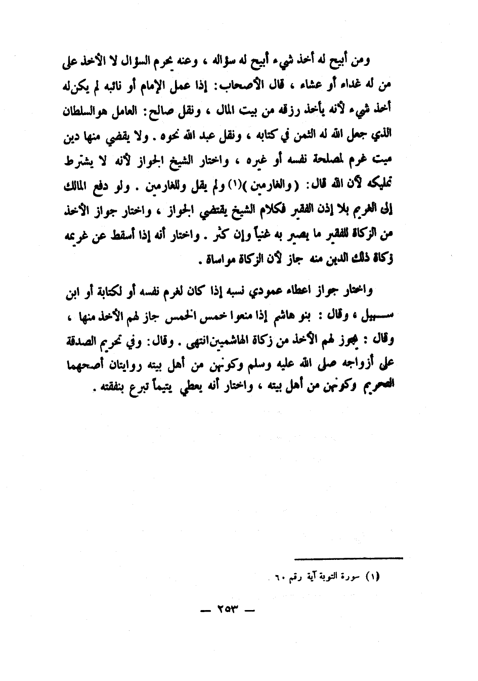 واختار جواز إعطاء عمودي نسبه إذا كان لغرم نفسه أو لكتابة أو ابن سبيل. وقال: بنو هاشم إذا منعوا خمس الخمس، جاز لهم الأخذ منها. وقال: يجوز لهم الأخذ من زكاة الهاشميين. انتهى. وقال: وفي تحريم الصدقة على أزواجه صلى الله عليه وسلم وكونهن من أهل بيته روايتان: أصحهما: التحريم، وكونهن من أهل بيته. واختار أنه يعطى يتيماً تبرع بنفقته.