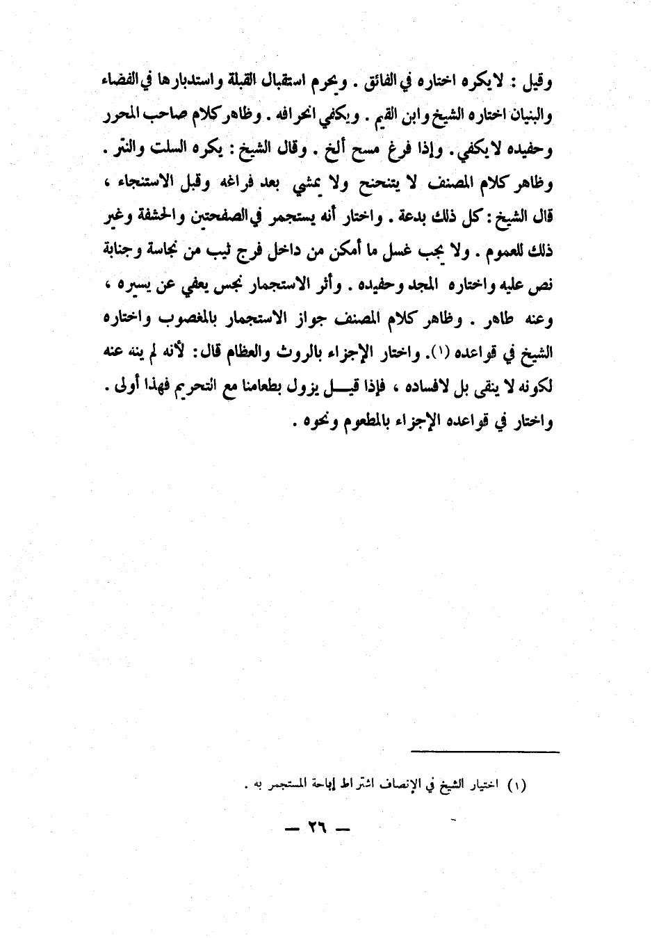 وقيل: لا يكره، اختاره في الفائق. ويحرم استقبال القبلة واستدبارها في الفضاء والبنيان، اختاره الشيخ وابن القيم، ويكفي انحرافه. وظاهر كلام صاحب المحرر وحفيد: لا يكفي. وإذا فرغ مسح ... إلخ. وقال الشيخ: يكره السلت والنتر.