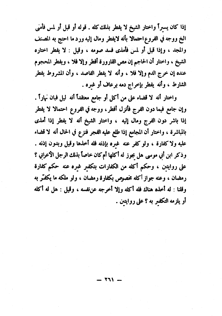واختار أنه لا قضاء على من أكل أو جامع معتقداً أنه ليل فبان نهاراً. وإن جامع فيما دون الفرج فأنزل أفطر، ووجه في الفروع احتمالاً: لا يفطر إذا باشر دون الفرج، ومال إليه. واختار الشيخ أنه لا يفطر إذا أمذى بالمباشرة. واختار أن المجامع إذا طلع عليه الفجر فنزع في الحال، أنه لا قضاء عليه ولا كفارة، ولو كفّر عنه غيره بإذنه فله أخذها، وقيل: وبدون إذنه.