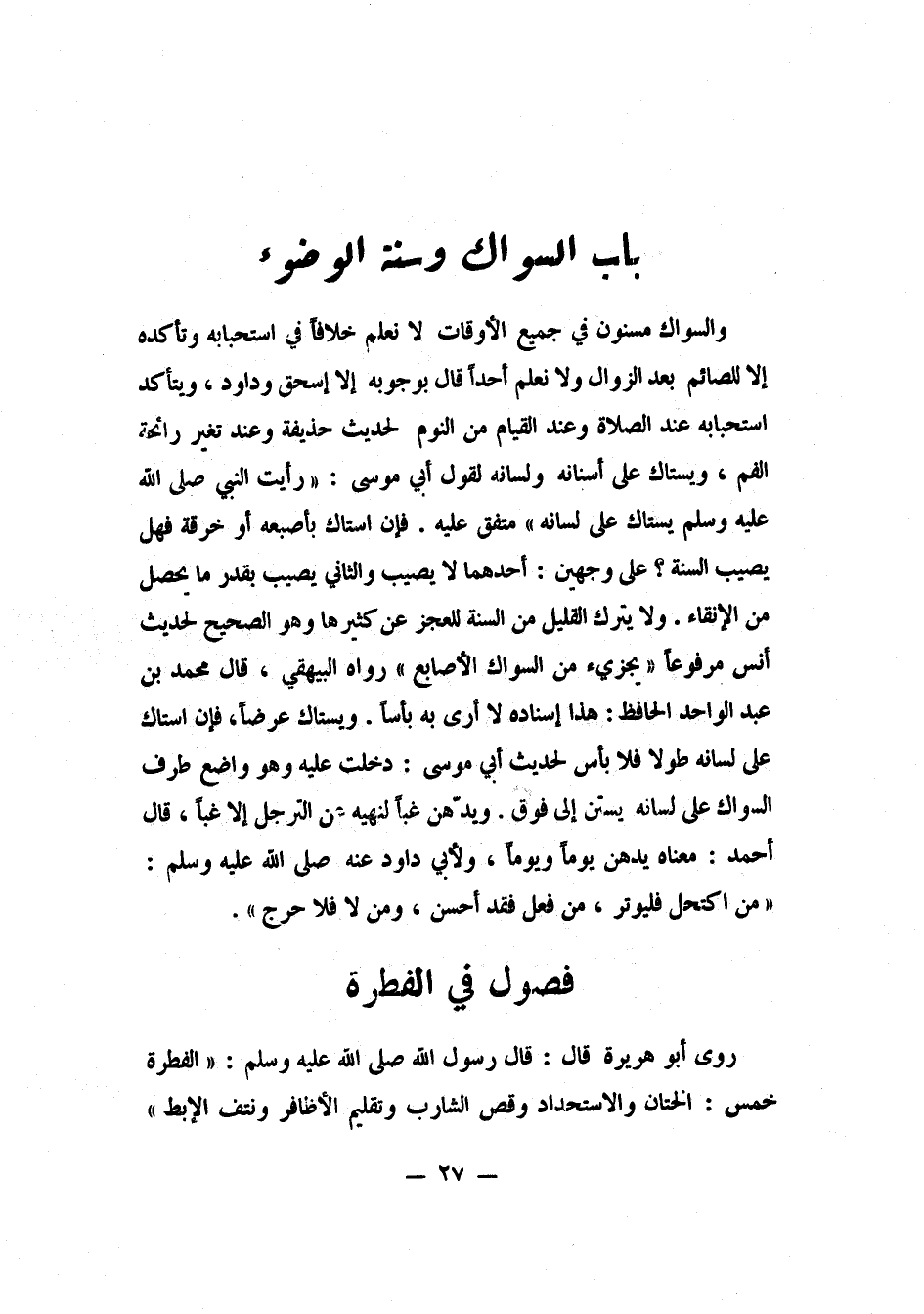 فإن استاك بأصبعه أو خرقة، فهل يصيب السنة؟ على وجهين: أحدهما: لا يصيب. والثاني: يصيب بقدر ما يحصل من الإنقاء. ولا يترك القليل من السنة للعجز عن كثيرها، وهو الصحيح، لحديث أنس، مرفوعاً: "يجزئ من السواك الأصابع". رواه البيهقي، قال محمد بن عبد الواحد الحافظ: هذا إسناده لا أرى به بأساً.