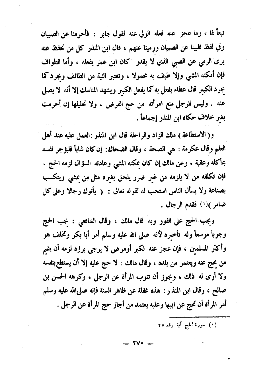 و (الاستطاعة) : ملك الزاد والراحلة، قال ابن المنذر: العمل عليه عند أهل العلم. وقال عكرمة: هي الصحة. وقال الضحاك: إن كان شاباً فليؤجر نفسه بمأكله وعقبه. وعن مالك: إن كان يمكنه المشي وعادته السؤال، لزمه الحج. فإن تكلفه من لا يلزمه من غير ضرر يلحق بغيره، مثل من يمشي ويتكسب بصناعة ولا يسأل الناس، استحب له، لقوله تعالى: {يَأْتُوكَ رِجَالاً وَعَلَى كُلِّ ضَامِرٍ} ، 1 فقدم الرجال.